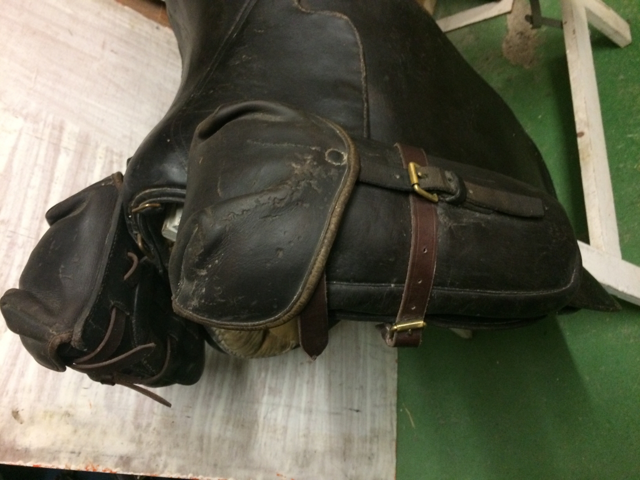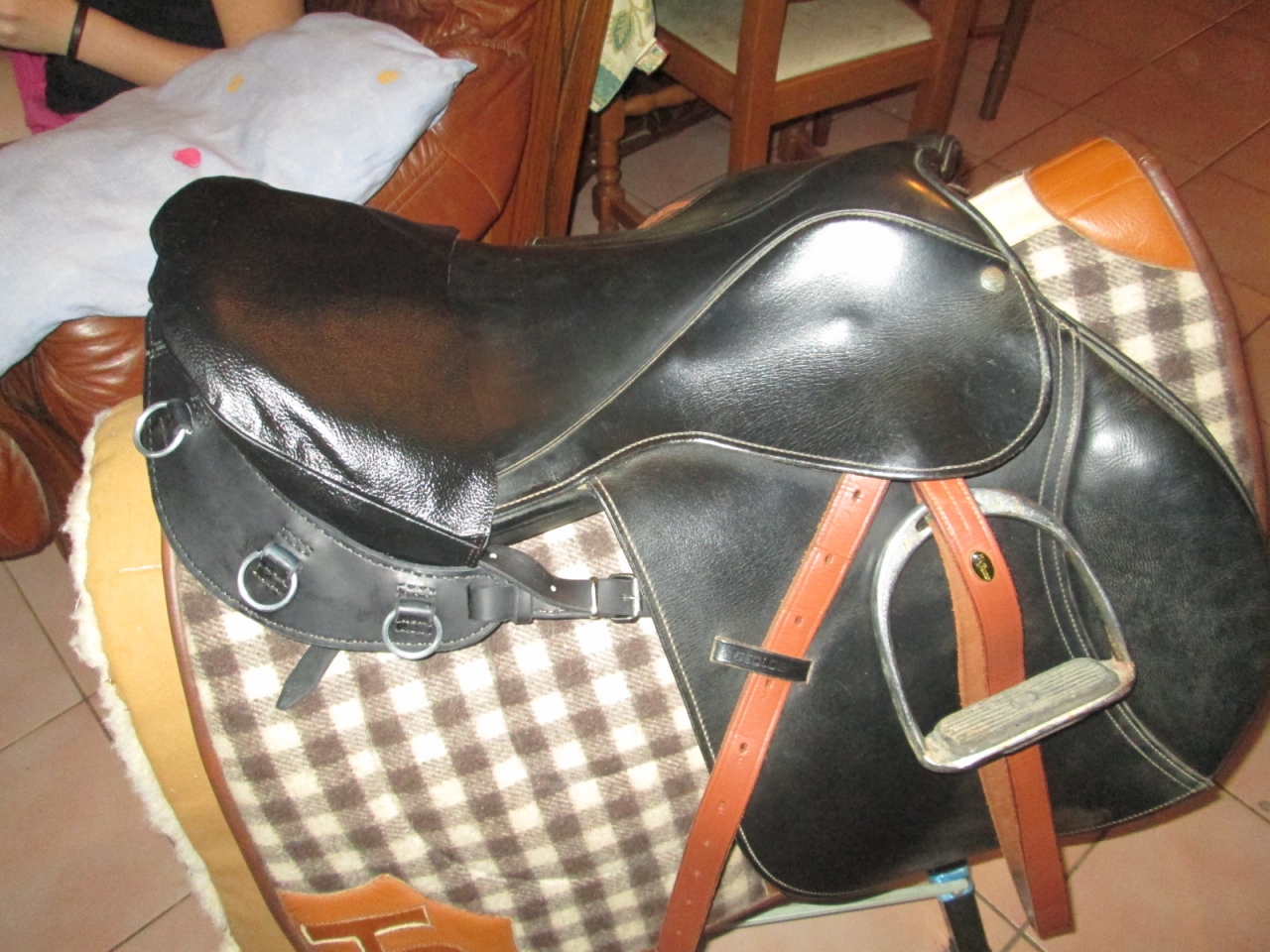 | Dire merci | Pour ne pas gêner le cheval, de bonnes fontes ne doivent pas le toucher. Pour cela, il ne suffit pas d'anneaux, il faut un véritable armature. Photo: selle de mon grand-père, datant de 1914 et encore utilisée à l'heure actuelle (normalement, elle est dans le bon sens, mais le logiciel de transfert l'a tournée): ![]() |