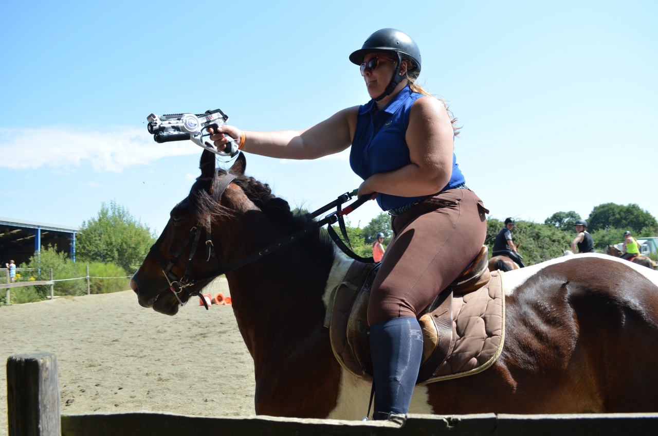 | Dire merci | Parce que j'en ai parlé sur mon post photo mais que peu le suivent, et que cette discipline reste encore très très méconnue, et c'est bien dommage ! Pour celles et ceux qui ne connaissent pas, le laser game à cheval : - se joue avec un palonnier et non des rênes classiques, ce qui permet de diriger très facilement à une main et de ne jamais perdre ses rênes puisque le système est accroché à la selle ![]() - équipés d'un pistolet, deux modes de jeu sont possibles : en affrontement ou sur un parcours de cibles. Pour l'affrontement on programme les pistolets en changeant la couleur pour définir les équipes, et on tire sur les copains. Des voyants lumineux s'éteignent pour symboliser les vies perdues, au bout de 6 c'est perdu. Pour les cibles, celles-ci représentent des monstres et sont équipées d'enceintes. C'est l'enceinte qu'il faut viser, et lorsque la cible est atteinte elle émet un bruit d'arme à feu puis le cri du monstre. On peut placer les cibles où on veut et imaginer des parcours chronométrés pour ajouter de la difficulté. C'est vraiment sympa, j'étais sceptique et puis finalement on se prend super vite au jeu ! Vous connaissiez ? Qui a déjà essayé ou serait tenté ? |