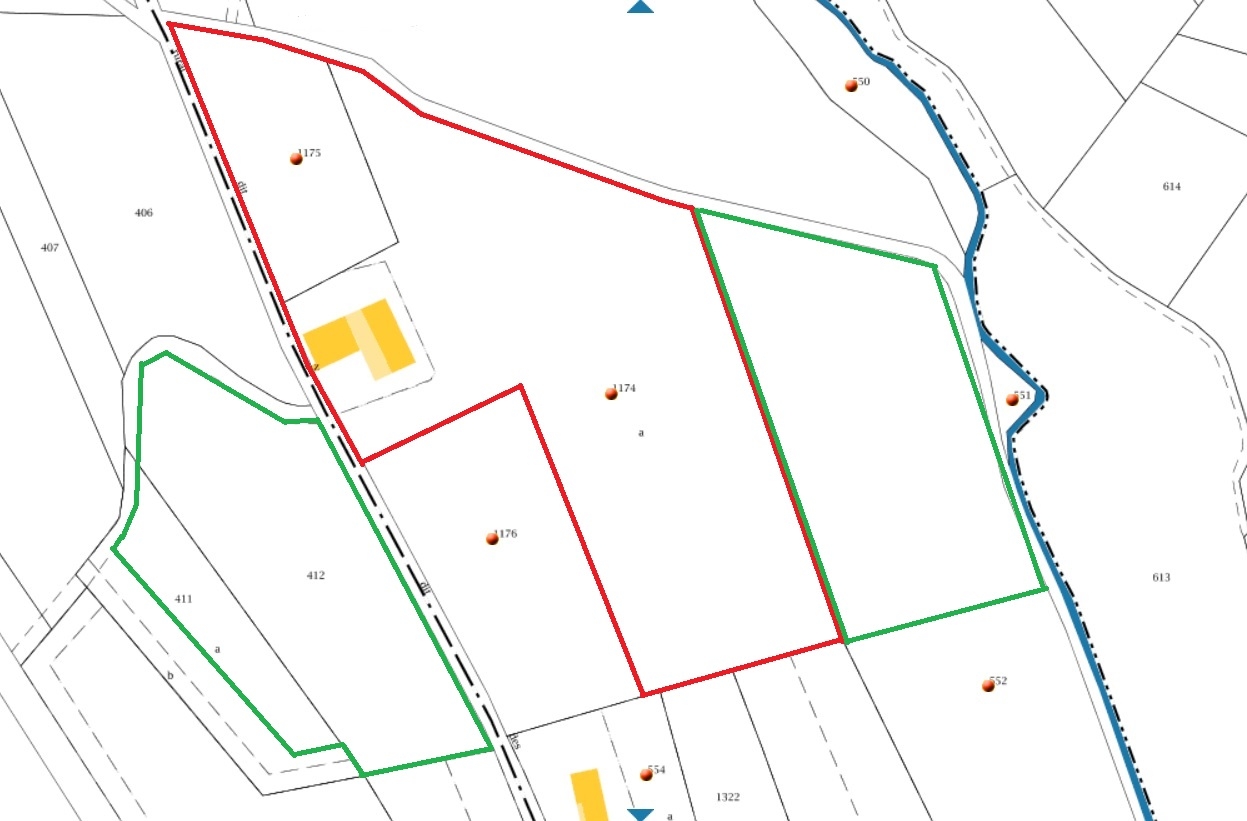 | Dire merci | Voilà à quoi ça ressemble. Ce qui est en rouge est à moi. Tout ce qui est à droite de la maison est en pente. En vert à droite, c'est la peupleraie. En vert à gauche, une parcelle que je loue. C'est bien assez grand pour nous (j'ai aussi un pré loué qu'on ne voit pas ici, à 1 km, il fait environ 8500 m2, on fait le foin sur celui là, et sur la parcelle verte de gauche) ![]() |