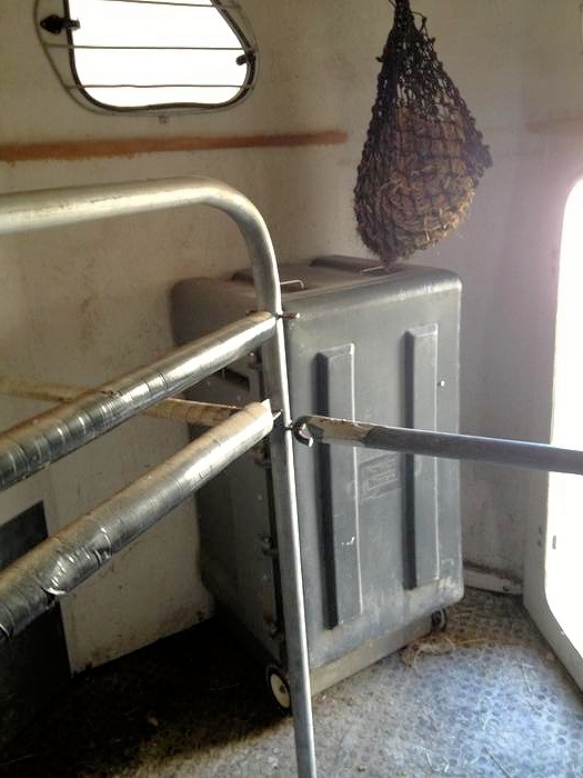 | Dire merci | J’ai un van 1 place et demi. Je ne veux mettre aucun matos dans la voiture pour ne pas la salir. Donc le matos est dans une malle Alfako que j’attache à la grille de la vitre devant (van Fautras) ou à l’attache de la roue de secours. Ca ne bouge pas d’un mm! Seul bémol, je ne peux pas utiliser la porte avant. Mais je préfère faire reculer le cheval que pourrir le coffre |