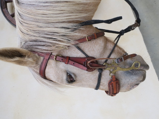 | Dire merci | Hack : oui, sur la palomino, je le remonterais aussi. Pour la gourmette, je dirais plus de 1 doigt : il faut que quand on agit sur les rênes, la gourmette vienne au contact quand l'angle fait 45°, pas avant. |