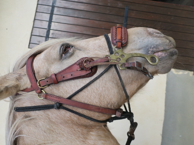 | Dire merci | Sur la jument crème, les réglages ne vont pas non plus le hack n'est pas assez haut et la goumette ne me parait pas assez lâche (sans certitude) Par contre, les branches du hack sont à leur bonne place hormis la hauteur |