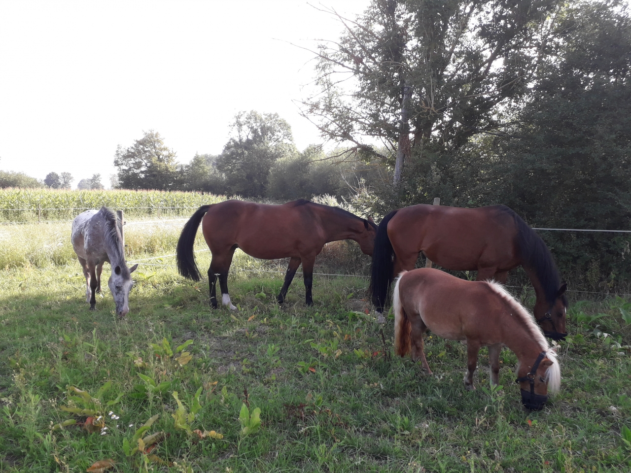 | Dire merci | Y a une ponette avec mes juments, c'est l'exclue du groupe. Les chevaux ne sont pas toujours fan de la compagnie de plus petits équidés On m'a proposé un shetland cet été, j'ai refusé, ça m'aurait obligée à refaire toutes mes clôtures... franchement pas envie... Bref, si un jour je dois prendre un poney pour ma fille, celle ci devra attendre d'avoir la bonne taille pour un C minimum. |