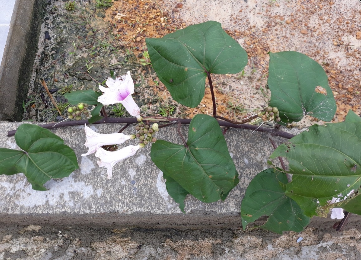 | Dire merci | Ce ne sont pas les feuilles du Datura, et si les fleurs ressemblent un peu, ce n'est qu'un peu. Cette plante me fait plus penser aux ipomées, volubilis et autres liserons, mais je ne pense pas que ce soit ça non plus. |