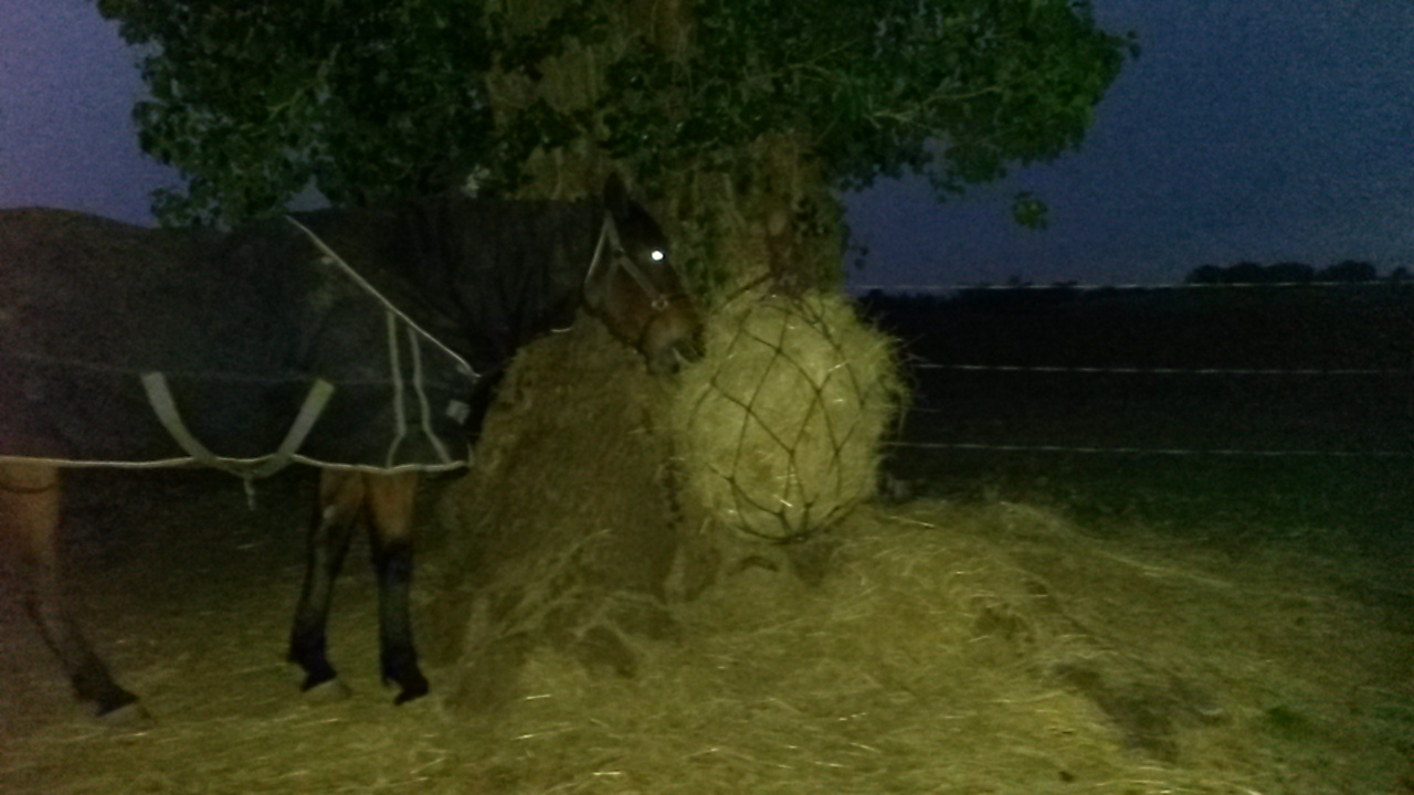 | Dire merci | Pareil Mon cheval avait les filets attachés en hauteur au box et en vrac sur l'herbe au pré. |