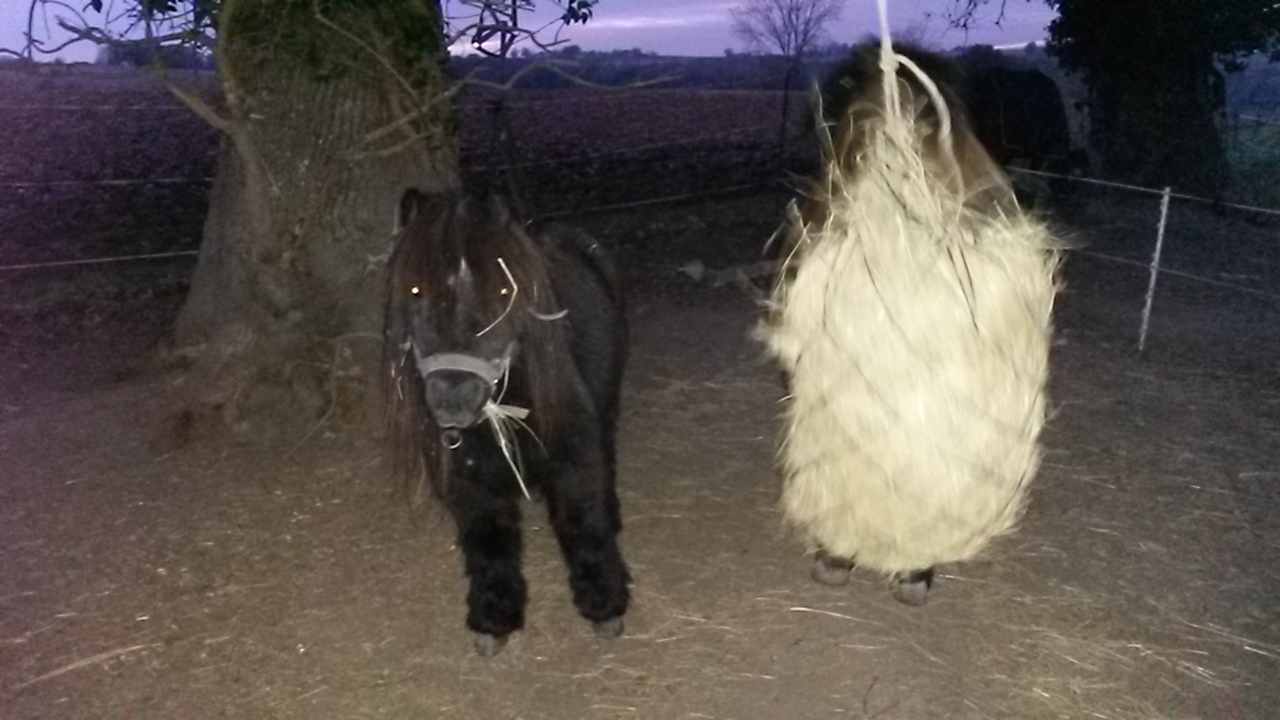 Déconnecté | Les miens, sont en box / paddock, pour l'hiver, foin à volonté (sans filets), sous abri, de 8h du matin, à 18h du soir, et au box , foin en râtelier pour la nuit. Pas de filets, je n'aime pas, un de mes chevaux ne sait pas manger avec, et ma jument, tire sur les cordes (trop peur qu'elle se bloque les dents , ou que sais je dedans ). Et tout va bien. Grains, et compléments, selon le besoin de chacun, matin, et soir. |