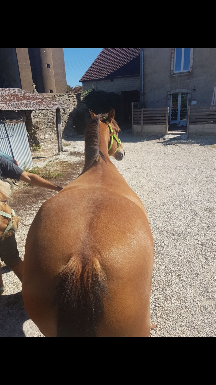 | Dire merci | TIens... Je me baladais et je retombe sur ce post ! L'occasion de donner des nouvelles à ceux qui avaient pris le temps de me répondre. Voilà donc plusieurs mois que nous travaillons sur le montoir (que ça passe vite !) C'est pas encore ça mais ça s'est gradement amélioré. Nous avons pris la décision de complètement sortir de son contexte le montoir. Je monte hors carrière pour décontextualiser. Je monte depuis un montoir assez haut pour ne pas prendre appui dans l'étrier. Je donne une friandise, une fois dessus et immobilité obtenue. ça porte ses fruits. Je peux maintenant monter sans aide et elle se place de mieux en mieux devant le montoir. (elle a bien compris le principe de la friandise , mais je suis très contente puisqu'elle ne quémande pas) Elle couche encore un peu les oreilles mais elle se positionne bien et se retiens très fort de bouger ==> du coup je monte plus rapidement ==> elle monte moins en pression. Bref, c'est super long mais ça progresse. Par contre, toujours un pincement des lèvres et un regard qui en dit long quand je sors la selle... Elle n'aime pas, clairement. Et elle est super compliquée à habiller... J'arrive pas à trouver une selle qui va parfaitement. L'actuelle tourne un peu... pourtant elle pose bien mais avec ses épaules de camionneur, son garrot noyé dedans et son dos en tonneau... C'est compliqué (sinon je vous assure qu'elle est jolie hein )De toute façon, je me met à économiser pour faire venir un SF au plus vite... Une idée de selle pour une Franche montagne ? . |