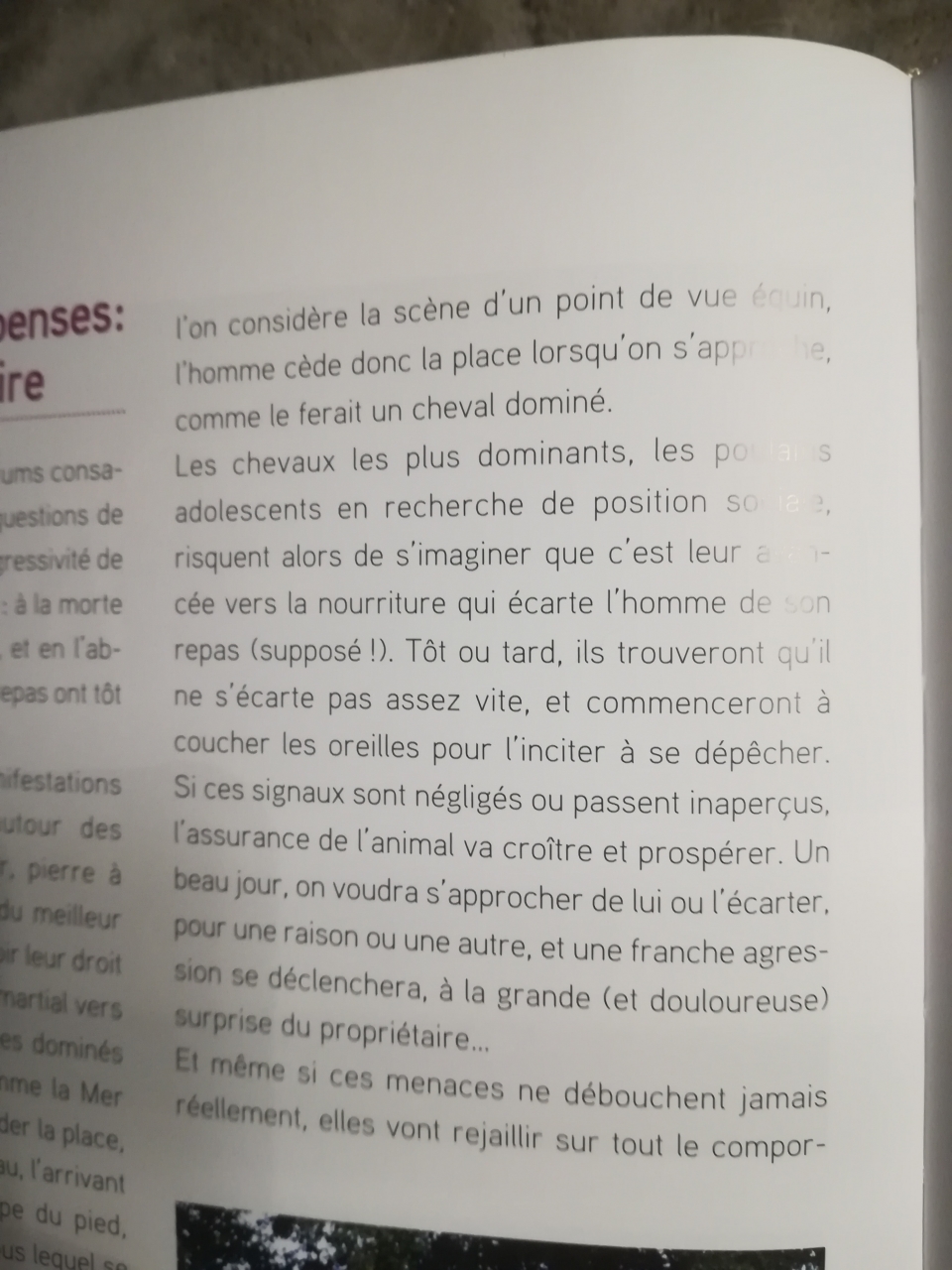 | Dire merci | @CaroDadou Si le poney de réagit pas, voir attaque quand il devrait déguerpir, ça n'est pas l'escalade de la violence qui règlera le problème. Peut-être que ton timing n'est pas toujours pertinent ou ton attitude manque de conviction... Au début avec mon poney, il m'arrivait de le chasser systématiquement matin et soir : interdiction de m'approcher à moins de 3 mètres pendant 1 semaine d'affilée. Pour éviter de me mettre en danger, j'ai vite compris que le mot clé est "anticipation". Quand le cheval agressif est à 1 mètre de toi, c'est trop tard pour agir. Tu n'es plus en sécurité. C'est quand il est à 3 mètres de toi et qu'il commence à penser à s'approcher qu'il faut le chasser. Prends une chambrière et élargit ta bulle ! |