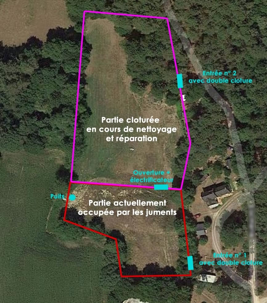 | Dire merci | ![]() Voici la configuration des lieux. L'individu entre par l'entrée n°2 et se trimballe dans le bas de la pâture et coupe l'électrificateur pour faire je ne sais quoi avec les chevaux. Il est vraiment dans la violation de propriété privée puisqu'il entre dans la parcelle pour venir voir les chevaux. Il ne passe pas par l'entrée n°1, il doit avoir peur qu'on le voit vu que c'est encadré de maisons... |