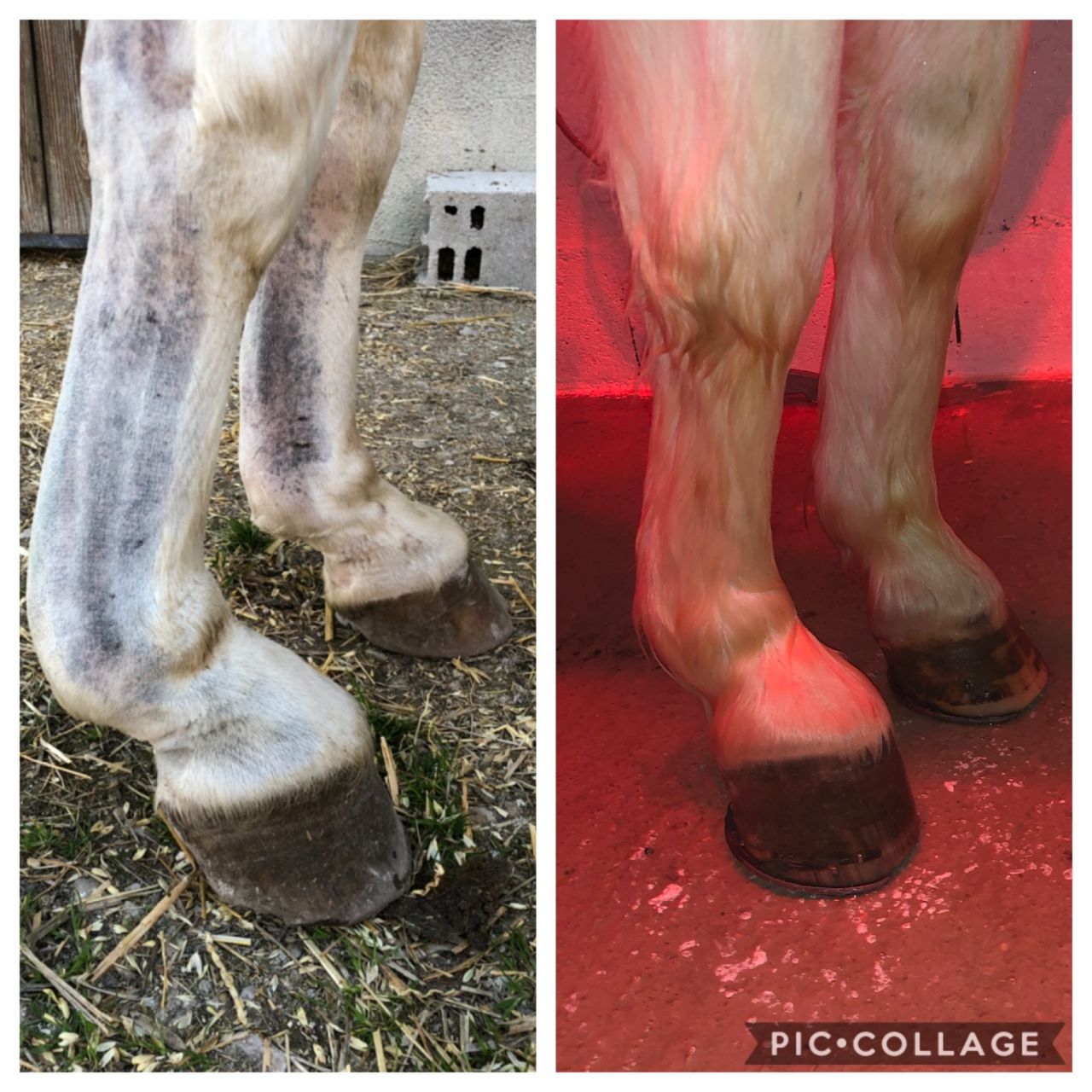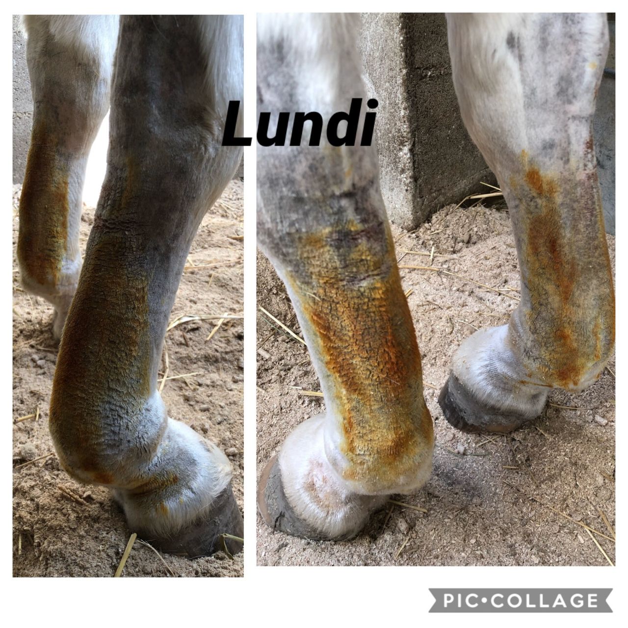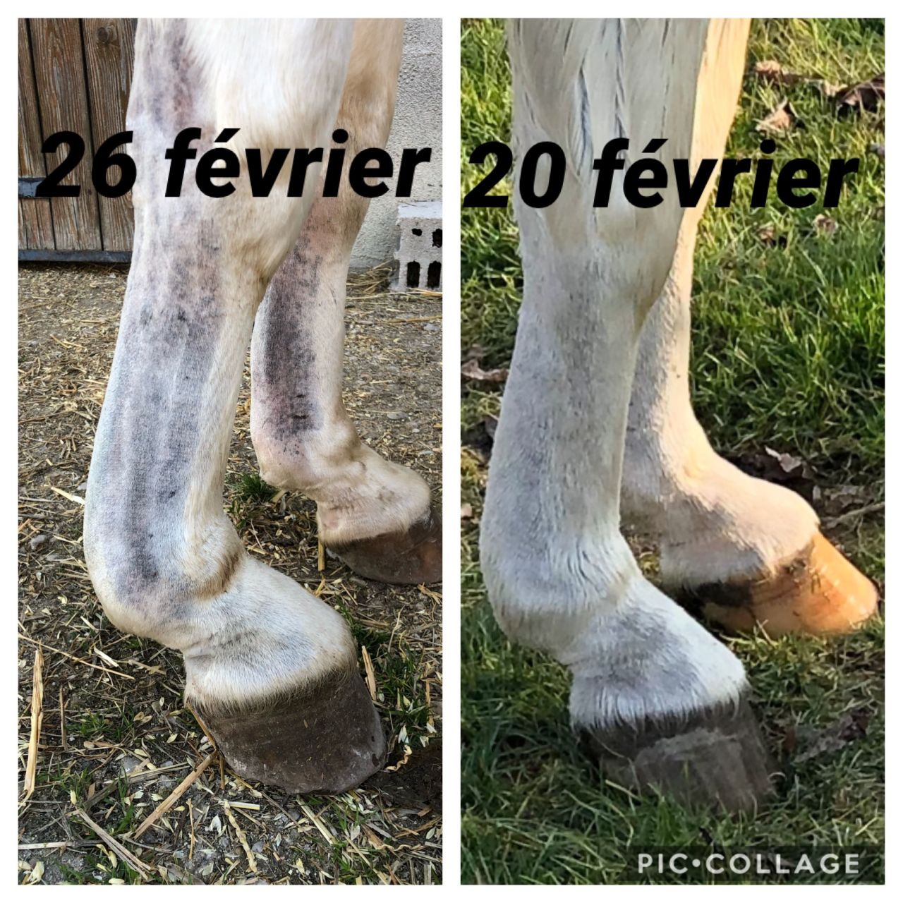 | Dire merci | Ouai je sais que ça va être long ça va déjà faire 1 mois là En faite jveu telement essayer de faire au mieux que je m’en retourne un peut le cerveau Hier soir je n’avais pas mis les guêtres magnétiques pour voir j’avais juste fait un bon massage à l’harpago gel Ba ce matin c’était moin bien , il était plus engorgé donc Jvai lui mettre obligatoirement la nuit ça a l’aire de faire sont effet quand même Donc hop une couche d’argile et au parc avec la ration et la dose d’equirenal Ce soir bonne douche , une séance d’ice Vibe en broutant, retoure au box et pose des guêtres magnétiques avec ration ( il me restait un fond de fenugrec j’ai commencé à lui en mettre hier soir ) je pense que ça ne pourra pas faire de mal |