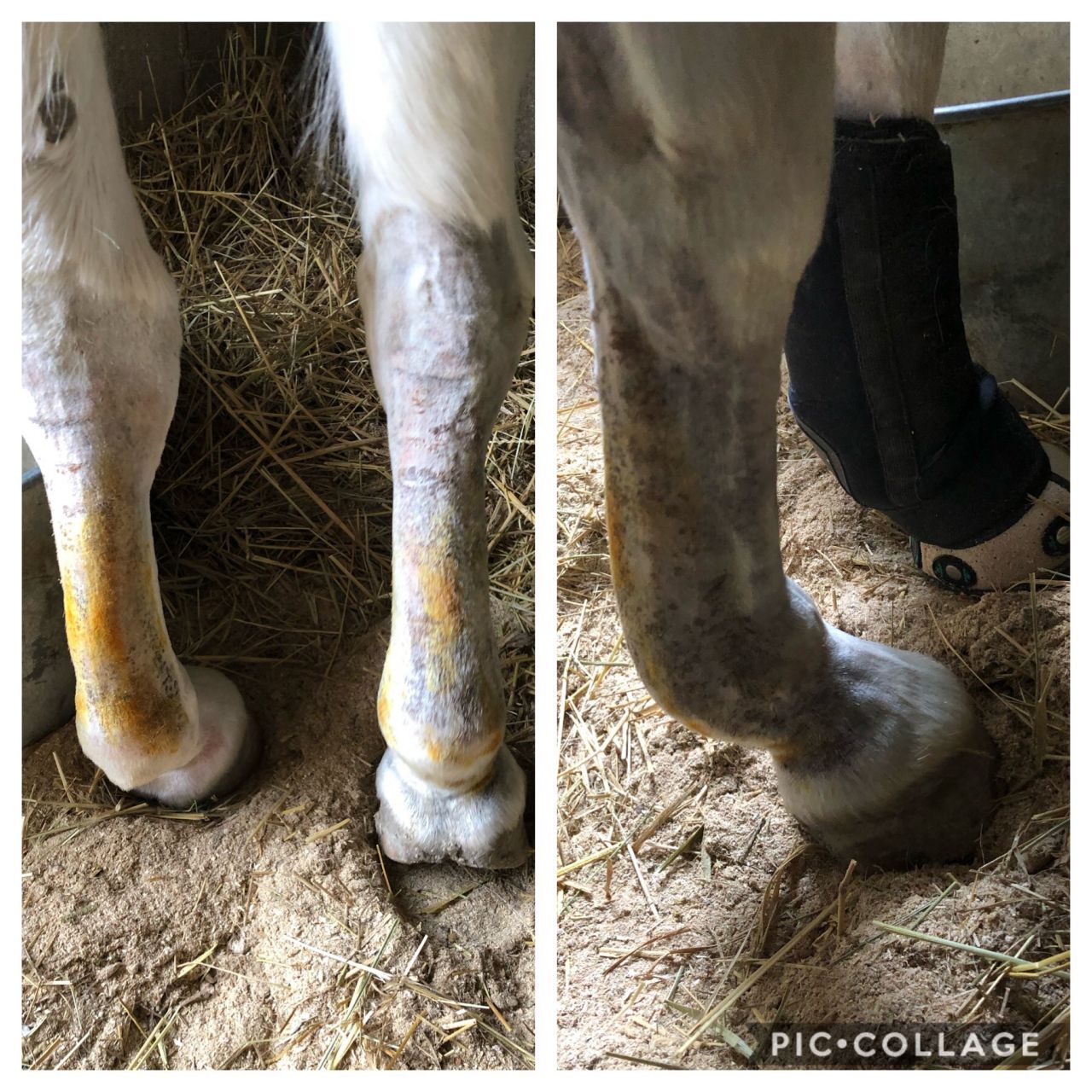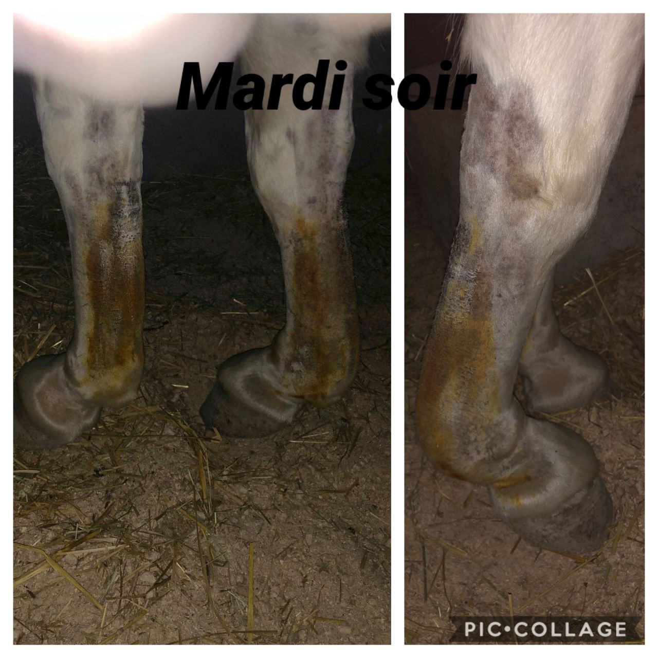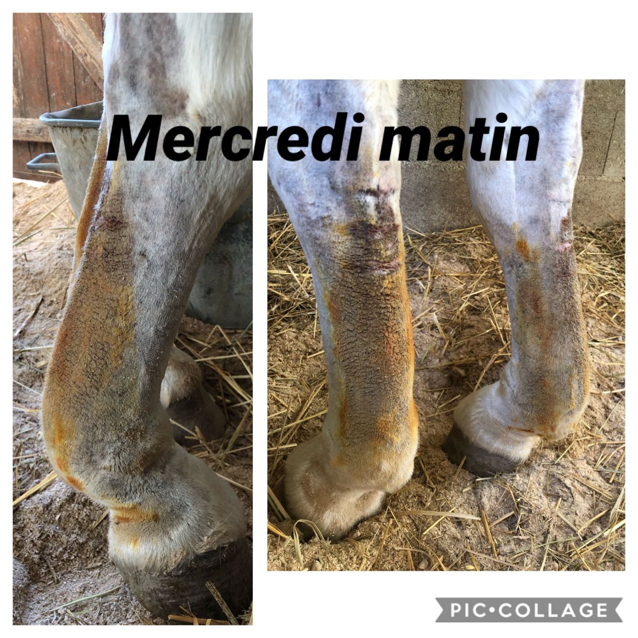 | Dire merci | Le maréchal est passé? Il y a quand même beaucoup de croûtes et la peau à l'air moche. Quitte à me répéter, mais argile + huile d'amande douce + gaulthérie (au minimum).... Ca va aider la peau et les tendons. En alternance avec tes ice vibe. |