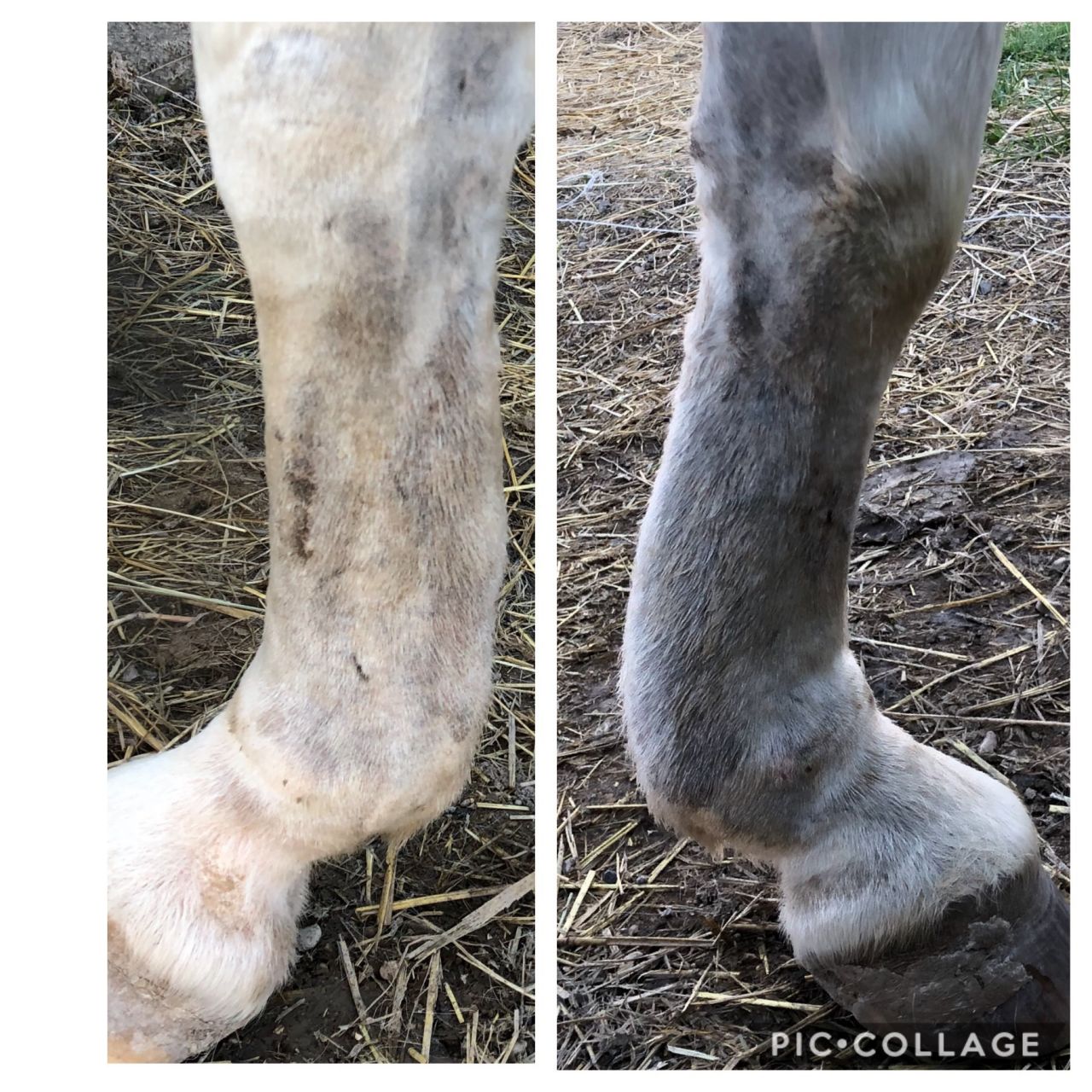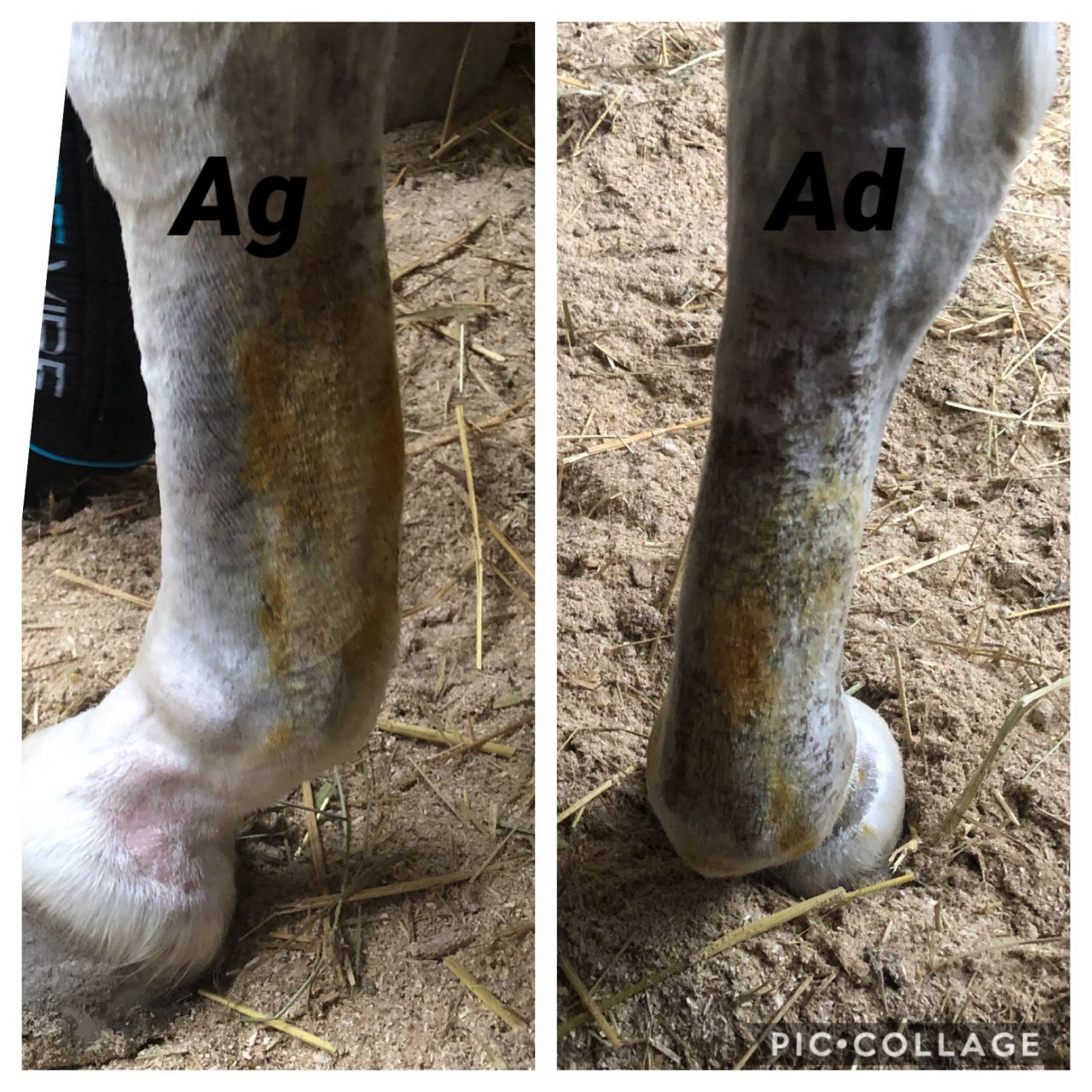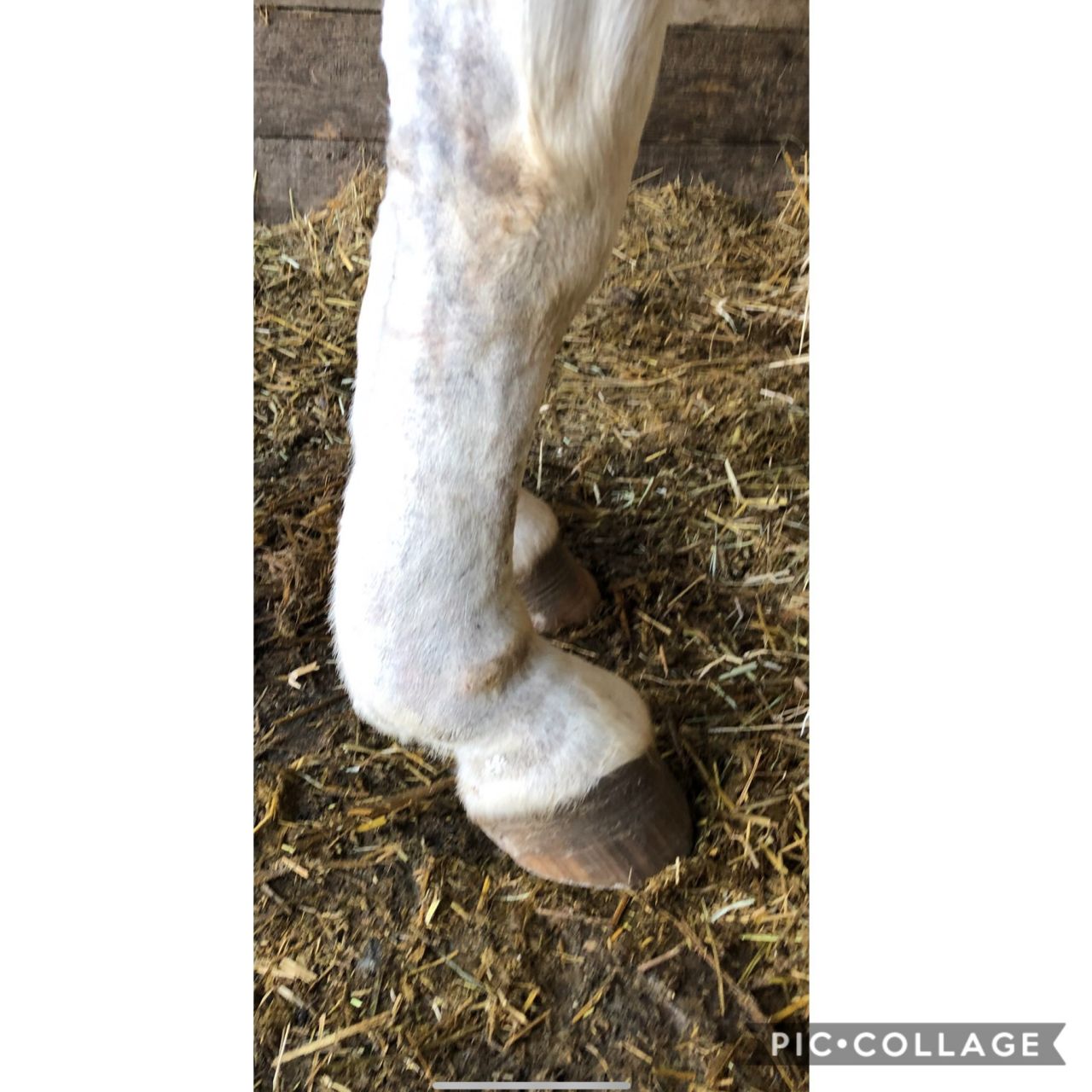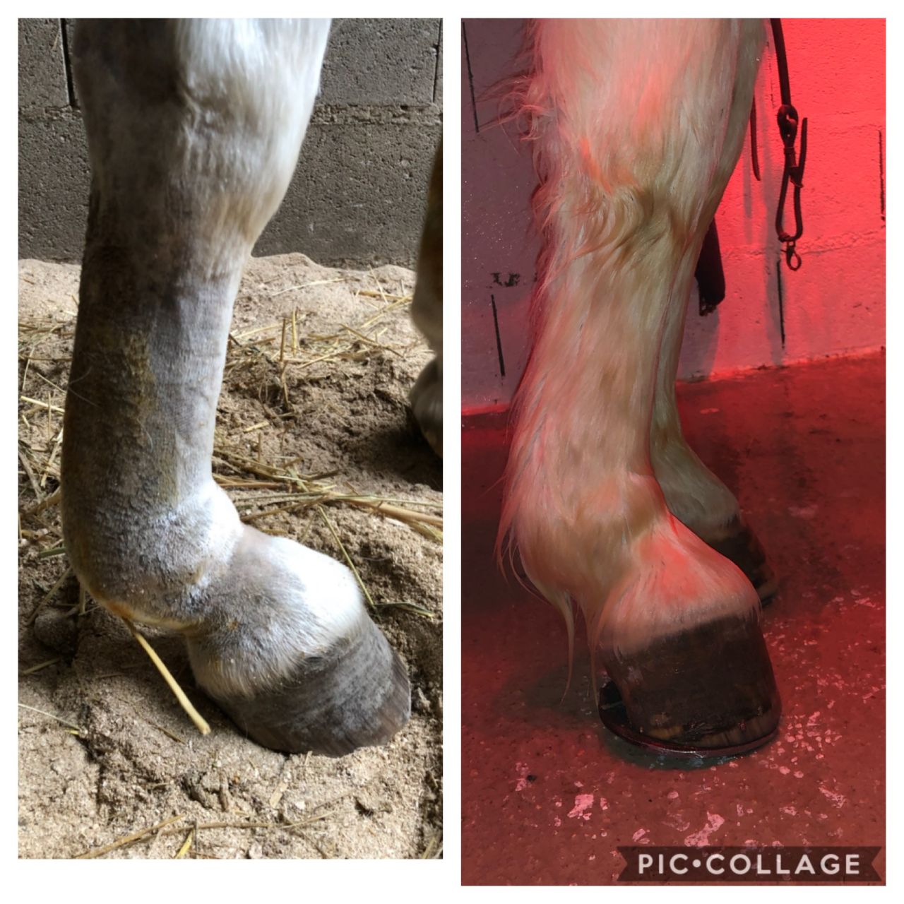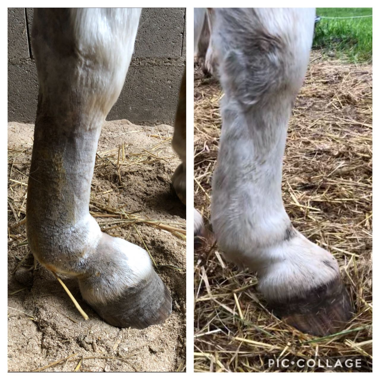 | Dire merci | Bravo ! Le droit c'est moins flagrant mais il a l'air de s'être redressé un peu et d'avoir dégonflé au niveau du boulet Par contre tu devrais voir pour corriger son high/low, ça doit lui tirer sur les tendons et ralentir la guérison |