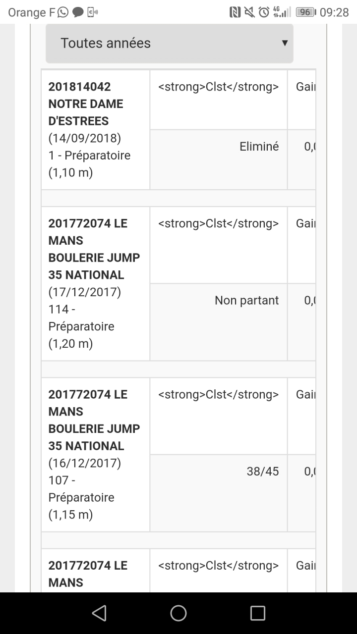 | Dire merci | Grace à ton image écran , j'ai trouvé la jument , elle est également éliminée sur 1 m en avril 2017 , donc ce n'est pas qu'un probleme de hauteur. Et depuis 2017 , c'est cata , franchement , pas la peine d'y aller. |