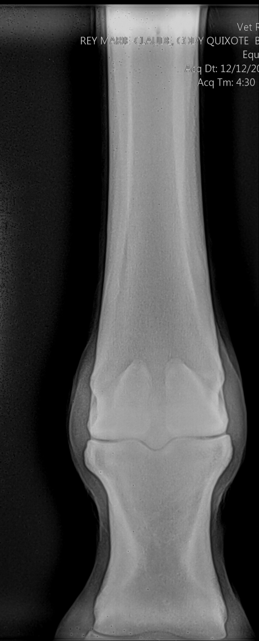| Dire merci | Dimanche j'ai longé Cody et il est irrégulier au trot. Il a tendance à se coucher sur le cercle à main droite. J'ai du mal à voir d'où provient la boiterie. J'ai plus l'impression qu'il est raide. Je prends toujours le temps de l'échauffer au pas aux 2 mains et de faire un assez grand cercle. Je ne longe pas très longtemps. Avant que je l'achète il a eu une grosse plaie non soignée à l'antérieur droit. ![]() Lors de la visite d'achat du 12/12/2017, la véto a indiqué : Déformation des tissus mous en regard de l'épaississement cutané consécutif au chéloïde cicatrisé face dorsale du boulet, sans atteinte osseuse associée. J'ai fait réaliser des radios. ![]() ![]() La boiterie pourrait elle être une conséquence du chéloïde ? Les tendons sont normaux. Je vais sans doute faire passer l'osteo dans un premier temps. D'autres tests à faire pour déterminer l'origine de cette boiterie ? |