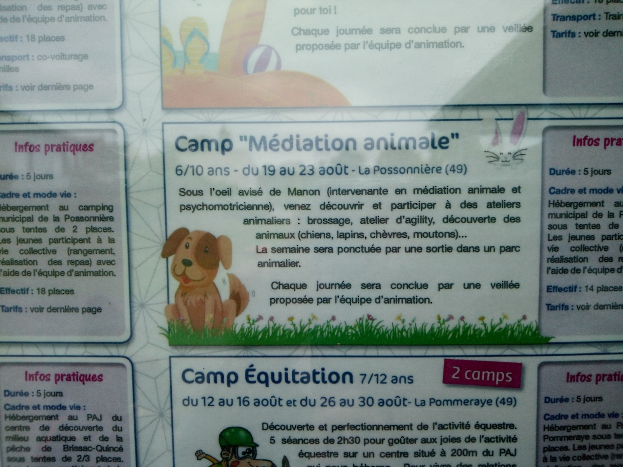 | Dire merci | Le souci ? Le public visé c'est des enfants de 6 à 10 ans. Dans un centre aéré. La semaine d'avant tu as pêche à la ligne, celle d'après équitation. On dit quoi à ces enfants ? On fait quoi avec ces animaux ? Les enfants ils vont venir pour bien profiter de leur semaine, a cet âge là et dans la configuration centre aéré c'est ignoble pour les enfants et pour les animaux. Faire croire que la médiation animale est possible dans ces conditions là c'est 😞😞😞 |