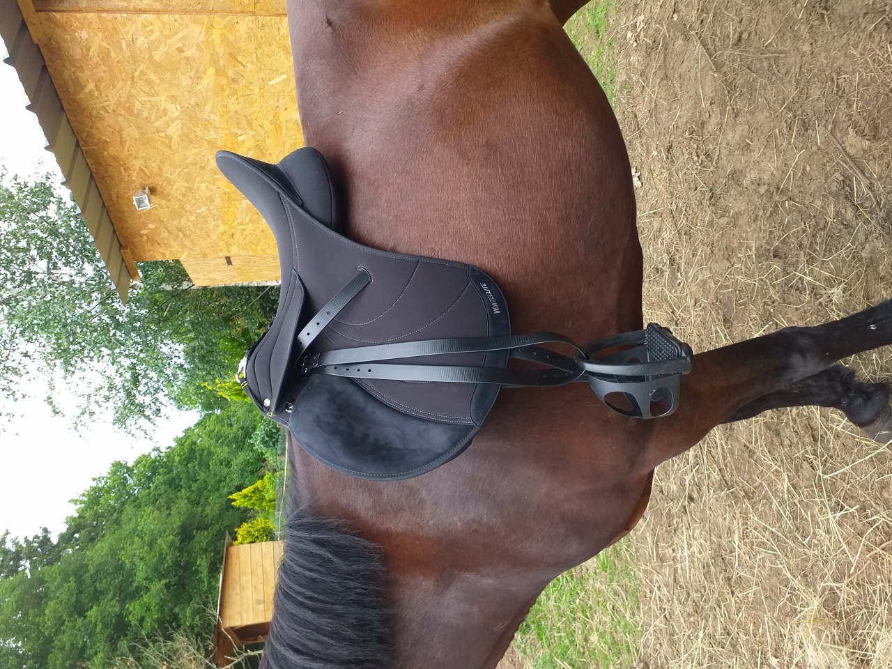 | Dire merci | Pour ceux qui avaient suivis la discussion, finalement sa c est terminé avec une norton! Un monsieur de chez padd est carrément venu chez moi avec plusieurs selle, il a constaté que en effet la lite de wintec que j avais acheté n allez absolument pas, il avait ramené une 500 mixte, une eric thomas hybride et eric thomas Fither et une nouvelle norton qui est même pas encore en vente avec une nouvelle matière, franchement quand j ai vu la selle elle m'a plus et j aurais pas pensé que c était une norton et en+ c était cette selle qui allait le mieux sur ma ponette donc super elle était pas cher , je l est a l esail Pendant une semaine et nickel je suis partie en trotting sur 15 km hier et les trace de transpiration étaient nickel voilà du coup finalement ma nouvelle selle est une norton |