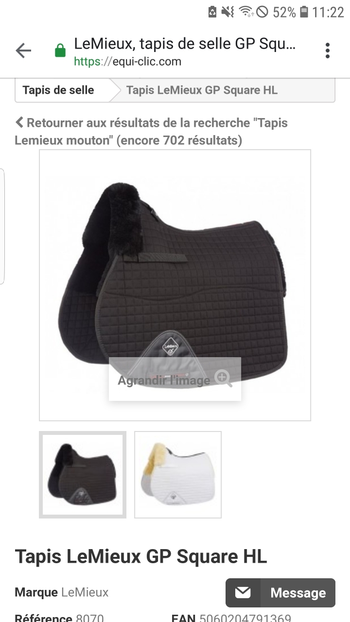 | Dire merci | Quand on peut pas essayer c'est la misère... A l'inverse, tu peux pas essayer un tapis haf ou un qu'il faudrait ? Je ne connais pas Lemieux, mais ça a juste l'air d'un tapis normal, avec du rembourrage, mais pour des selles a arçon... Faut garder à l'esprit aussi qu'une fois sur ta jument, le mouton va se tasser et le tapis ne sera peut-être plus aussi épais qu'il en a l'air sur la photo. |