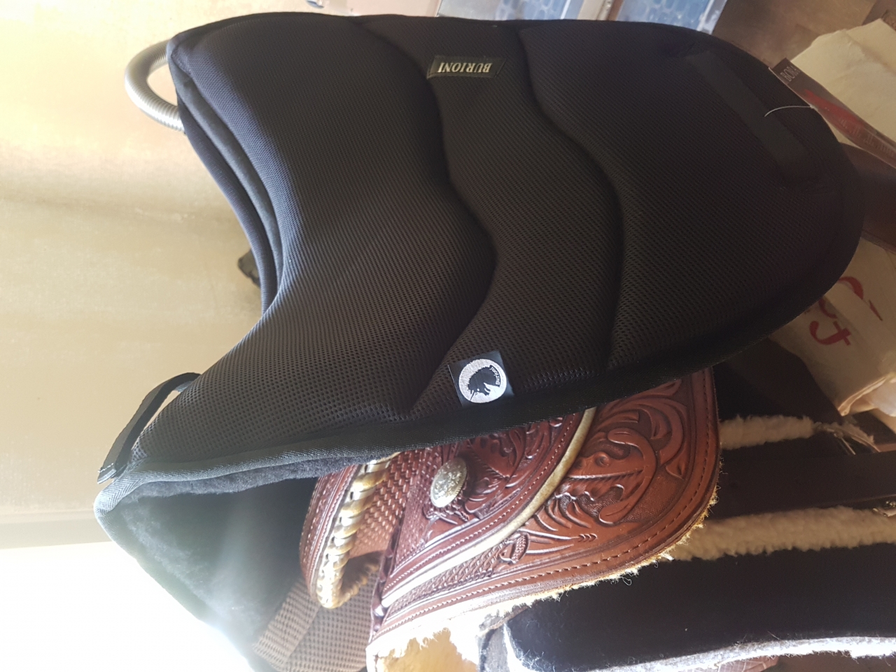 | Dire merci | Tiens c'est bête, mais j'y pense que maintenant, pour ce type de selle, est-ce qu'un tapis en feutre, tels que ceux que nous utilisons en western conviendrait ? Après tout, les selles western n'ont pas de matellassures, donc dans ce cas, c'est bel et bien le tapis qui en fait office... C'est ce que j'ai pour Peppy. ![]() |