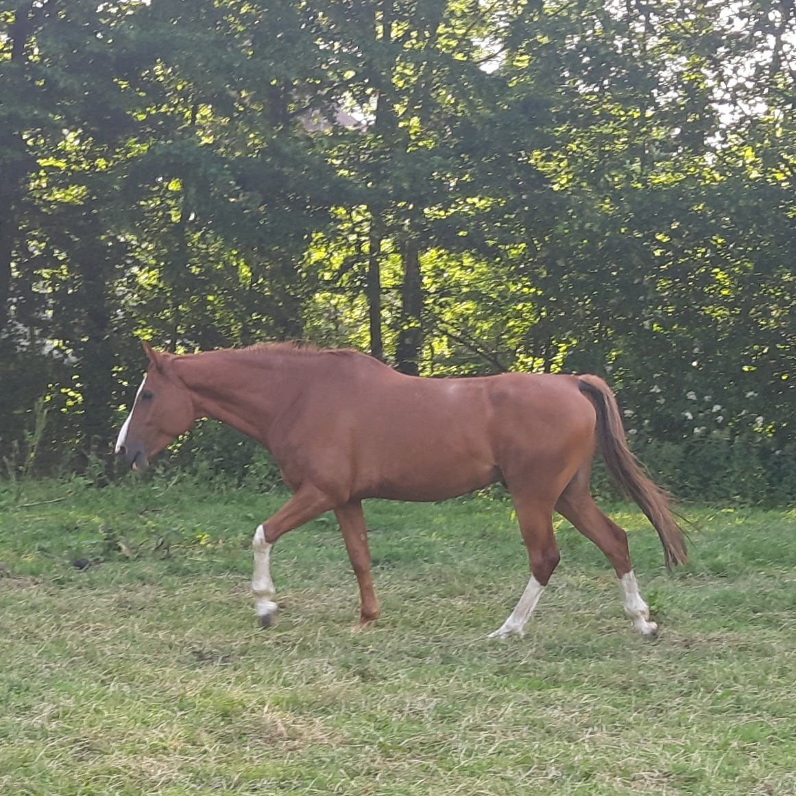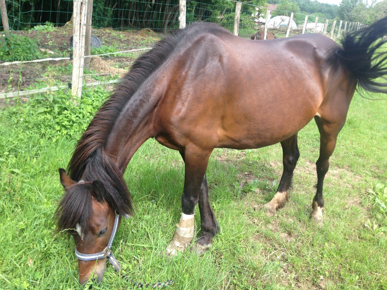 (d'où le bandage), elle n'a donc pas travaillé d'avril (le moment où elle s'est blessé) à décembre (le moment où le vétérinaire a dit qu'elle pouvait de nouveau être monter) et puisqu'en décembre il y avait beaucoup de boue... Bas voilà (c'est une photo de juin 2018, donc elle n'avait pas travailler pendant très très longtemps). Elle va maintenant très très bien et court partout dans les prés