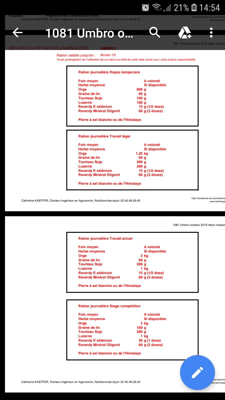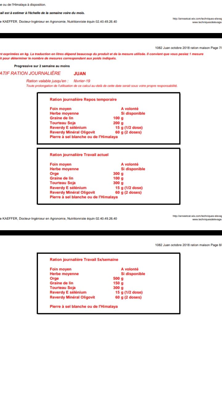 | Dire merci | Salut ! Voici les rations "maison" de mes 2 chevaux. Umbro est un grand kwpn, difficile à garder en état et Juan un petit PRE grassouillet (l orge a été supprimé pour lui).![]() |