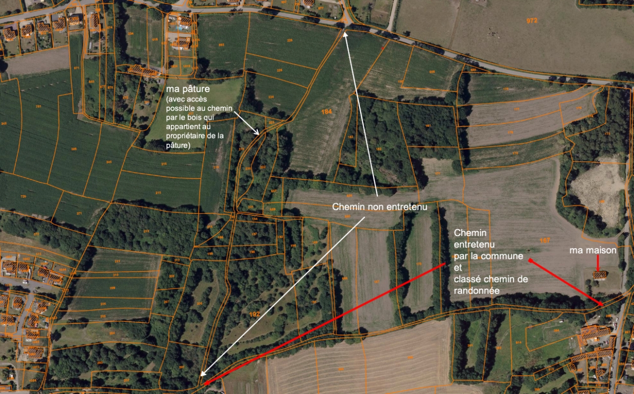 | Dire merci | le chemin a l'air de desservir plusieurs parcelles cadastrales donc à moins que toutes les parcelles n'appartiennent au même propriétaire, et qu'il soit disposé à acheter le chemin si c'est en vente, il y a peu de chance que ce soit en vente et donc "privatisé" j'ai un chemin communal qui passe juste devant la maison de mon voisin, puis qui passe dans le bout de ma maison et qui continue sur 500 mètres et se termine en cul de sac. ce chemin ne dessert que des prés que j'exploite. Mon voisin voulait qu'on s'arrange pour acheter chacun notre partie du chemin, comme ça il "privatiserait" sa cour en quelque sorte. La mairie était vendeuse. Mais ça n'a pas pu aboutir car le chemin dessert plusieurs parcelles appartenant à différents propriétaires, qui même s'ils me louent les parcelles, doivent potentiellement pouvoir y accéder par la voie publique en toute circonstance. Donc à moins que je n'achète tout, c'est pas possible! |