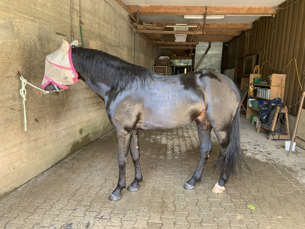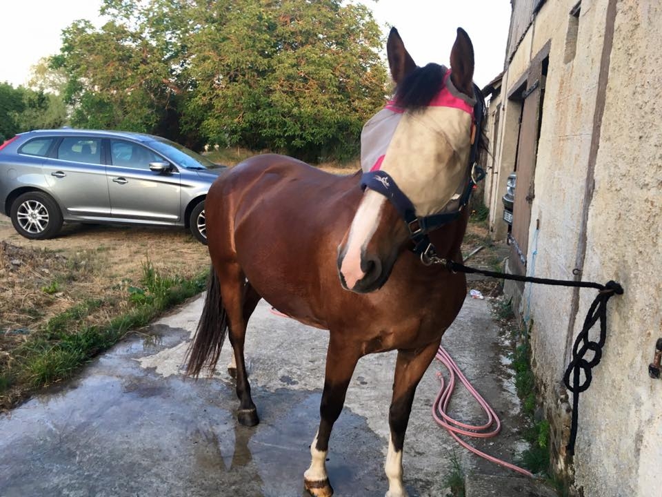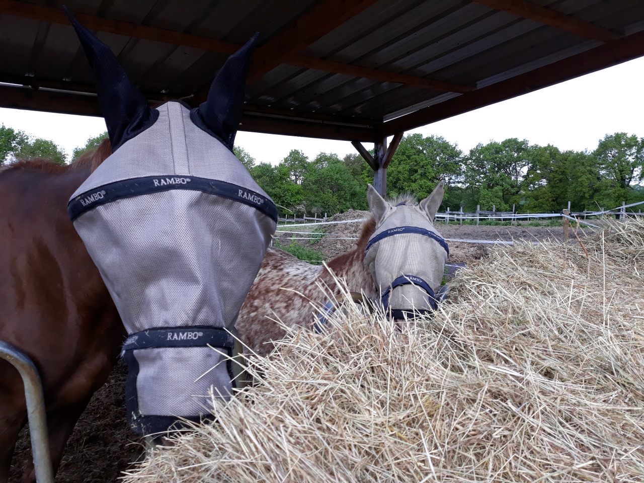 | Dire merci | Déjà un grand merci pour ces retours. Au niveau du nez, je mets de la crème solaire en plus. Ici, juste pour préciser la bavette c'est pour le head shaking, car sans il pète les plombs au soleil et me fait du head banging digne d'un concert de metal. Intéressant du coup de voir que la bavette du Rambo descend bien étant donné qu'elle est indispensable dans son cas. On avait dû faire une couture pour réduire le Bucas qui était trop long pour lui en plus. Pas d'arbre non plus, juste l'abreuvoir et des poteaux à vaches dans un des prés. Je dirais aussi qu'il est relativement soigneux. |