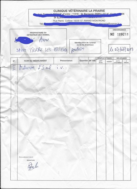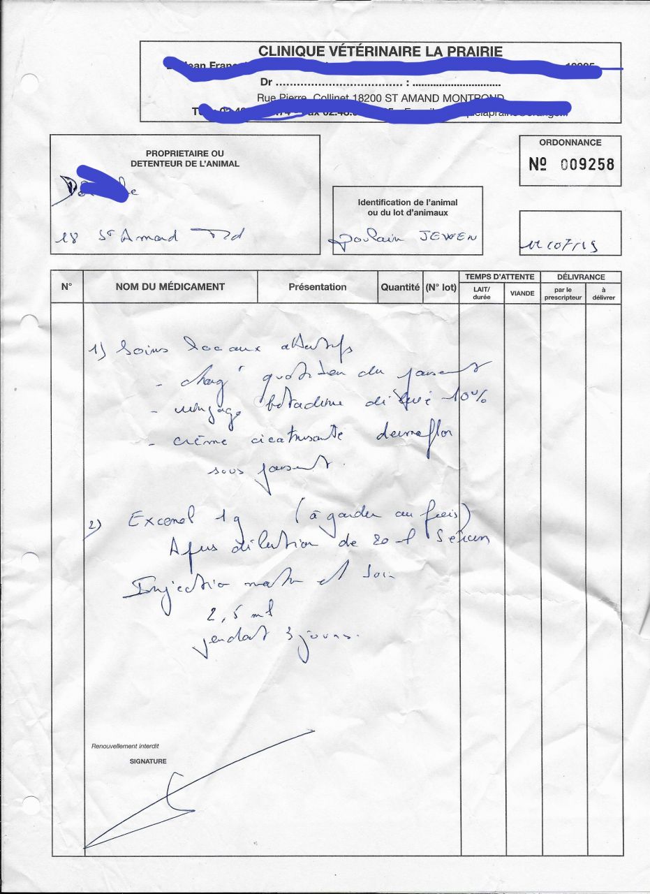 | Dire merci | merci pour ceux qui m'envoie leur soutien, ca me va très bien ! voici la première ordonnance que j'ai eu : ![]() Puis celle de lundi, fait par uen véto spé équin, qui a fait les radios: [url=https://www.1cheval.com/membre/services/photos/] ![]() Je n'ai pas tout à fait suivi ces recommandation puisque j'ai refais le bandage 24h plus tôt que prévu..... Je l'ai bien rappelé comme prévu pour donner des nouvelles cet apmidi, j'ai eul'avs qui doit transmettre mon message. Voici la prescription que j'ai eu par le 3ème véto ce matin [url=https://www.1cheval.com/membre/services/photos/] ![]() c'est mon véto habituel. N'ayant pas confiance en son jugement et vous faisant confiance j'ai été voir un 4 ème véto que je ne connaissais pas et qui m'a été recommandé par l'éleveuse et la gérante de la pension où j'ai mis ma jument et mon poulain. C''est un véto spé équin qui exerce en rural, Je n'ai pas sa prescription chez pour prouver mes précédents écrits... |