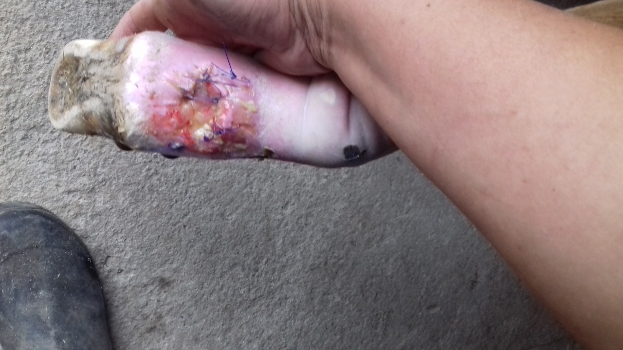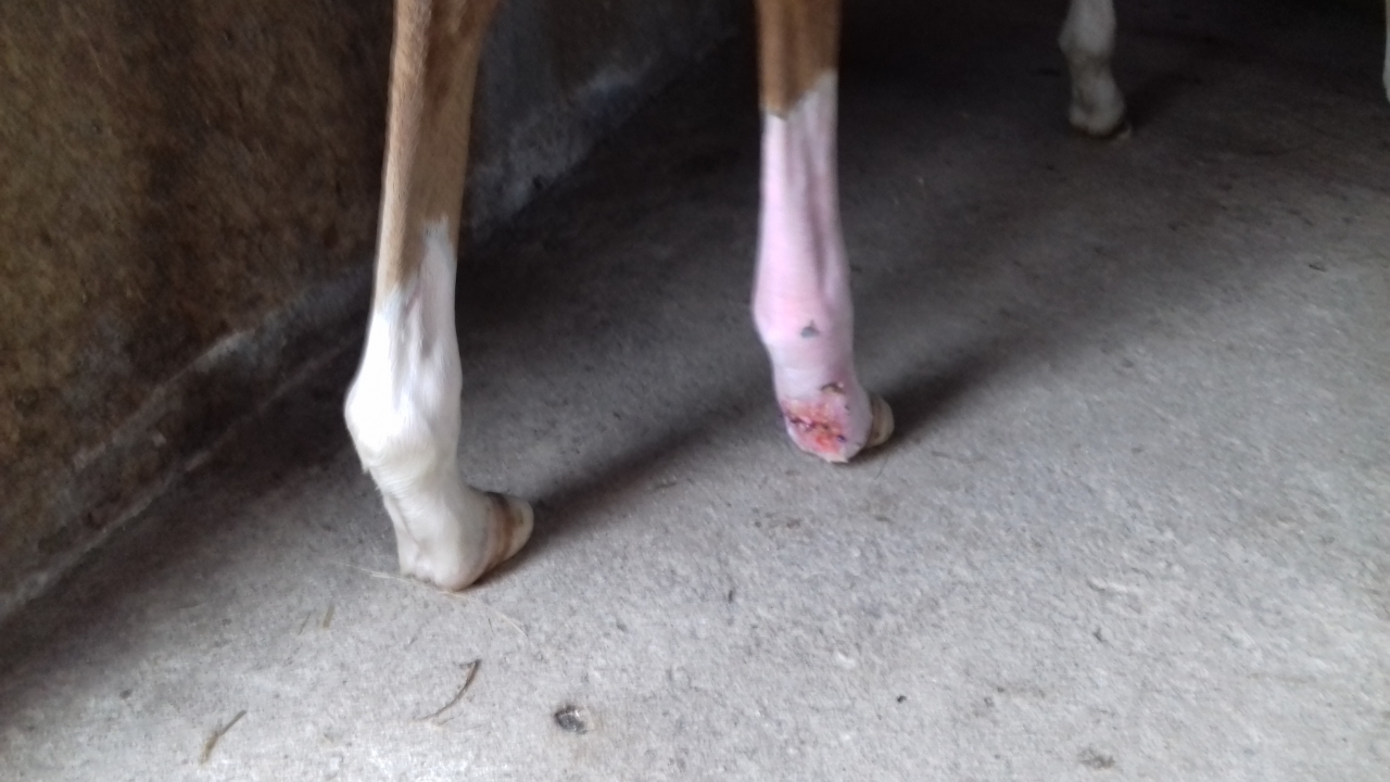 | Dire merci | Oui, la plaie est très jolie, ce matin c'était propre, le pansement avait bien absorber l'excédent Par contre, le jarret est pareil quhier Poulain vif, pas de fièvre, ça n'a pas l'air douloureux à la palpation, c'est un peu chaud et on sent le liquide sous les doigts |