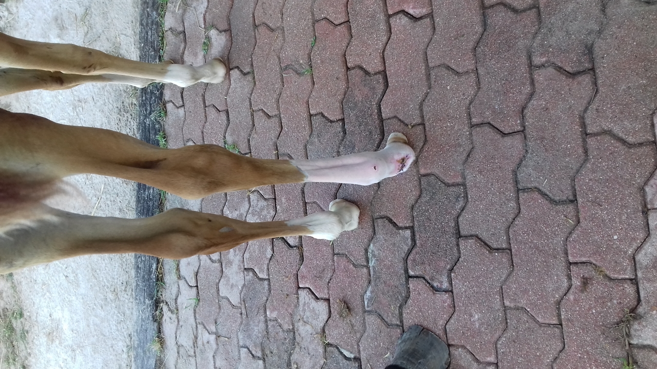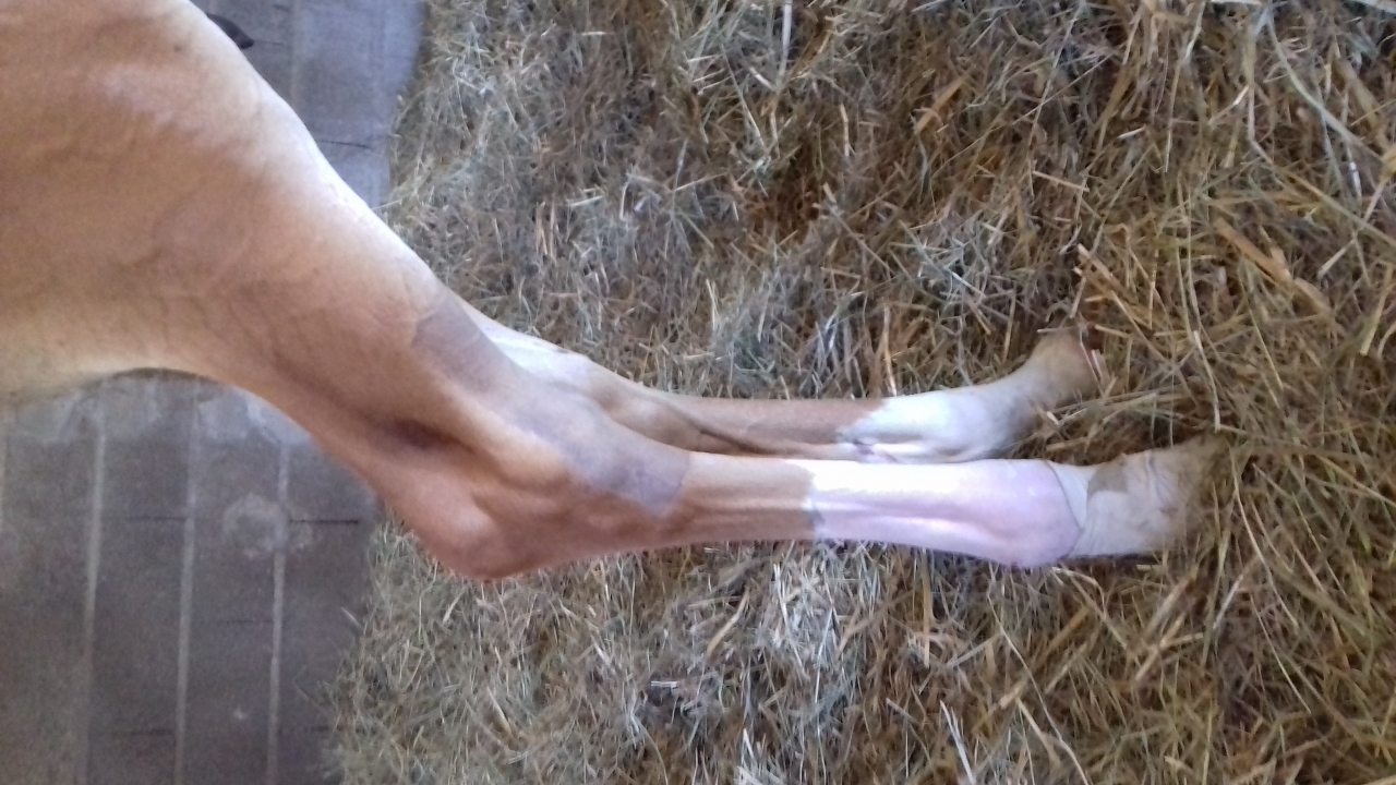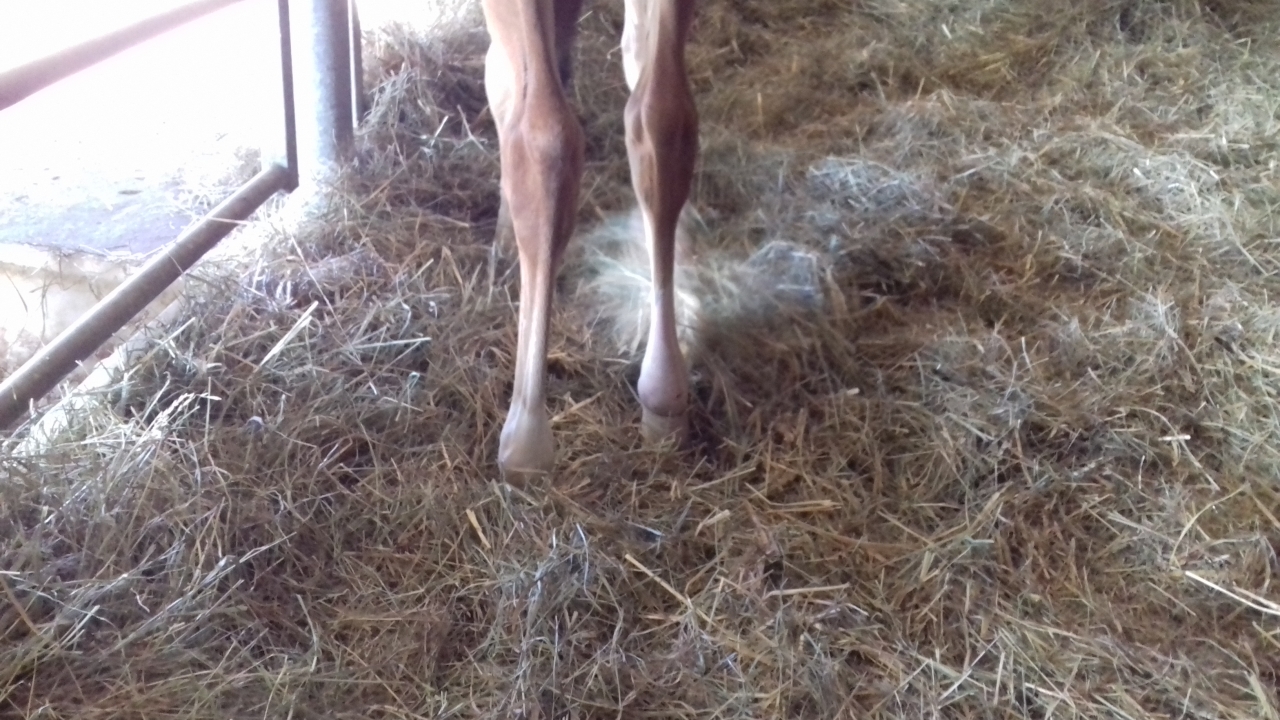 | Dire merci | Ce matin : Plus d epansement Plaie jolie comme tout (mêem si quel brins d efoin collés dessus) et ca désenfle un peu encore niveau paturon et boulet Le jarrêt à un peu désenflé. Il boite mais ca s'améliore. Niveau moral : excellant, très grande forme, ne cherche qu'à mordre quand je viens le voir (ce que je comprends tout à fait), rue, se cabre contre la mère, le foin.... La maman elle maigrit de jour malgrès foin à volonté (elle a le round, bon foin de l'année à disposition) et aliment poulinièrre ACH 3X jour avec de l'huile. J'espère que la véto sera ok pour un remis een tout petit paddock. Pas forcément bc plus grand que ce qu'ils otn là actullemement, mais au moisn que la mère puisse retourner un peu dehors, grignotter 3 brins d'herbe, poru son moral. (elle a vu dentiste il y a 3 semaines et ostéo il y a 15j |