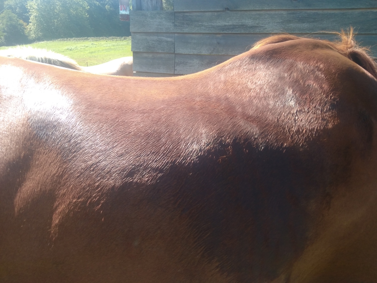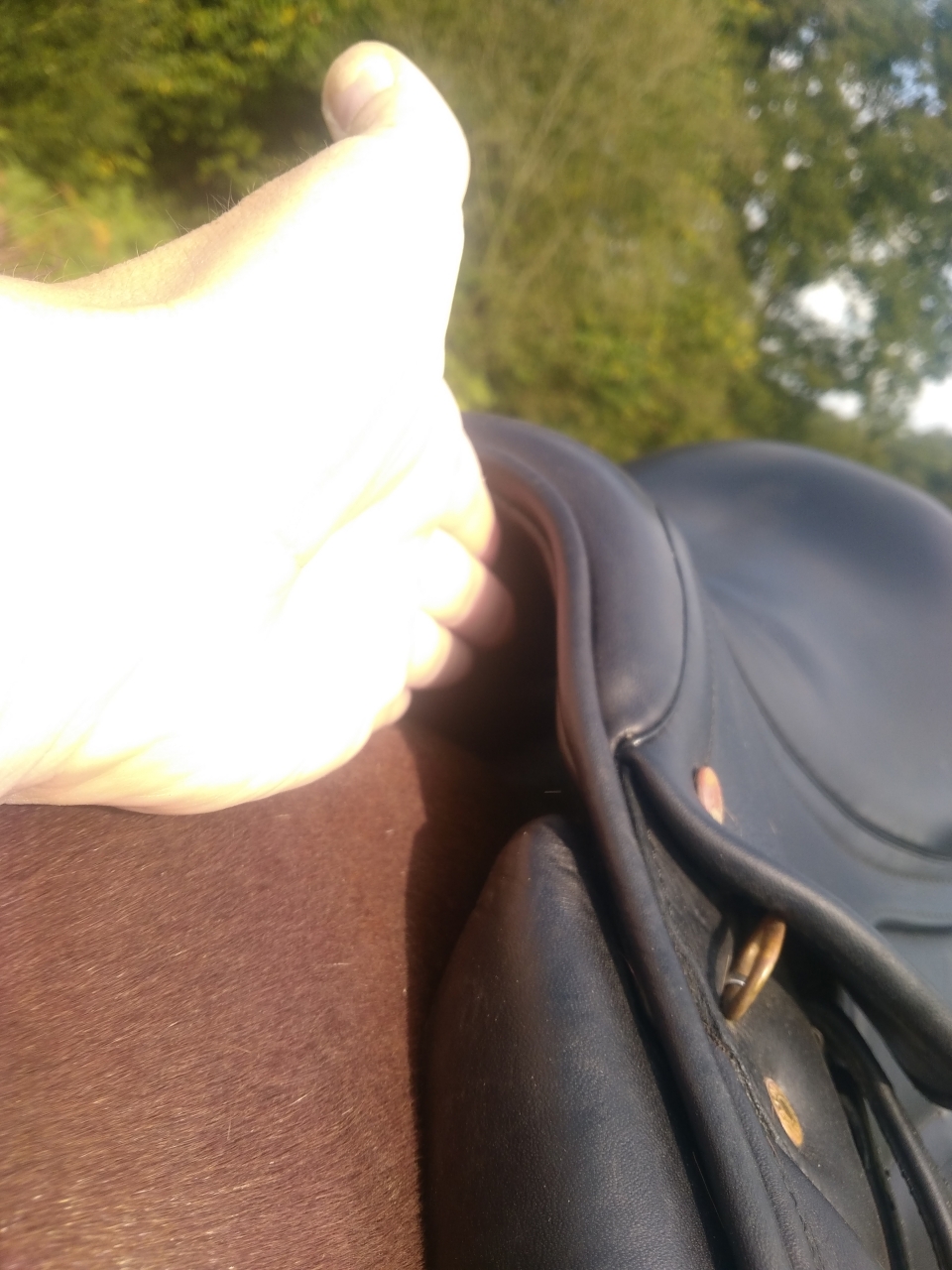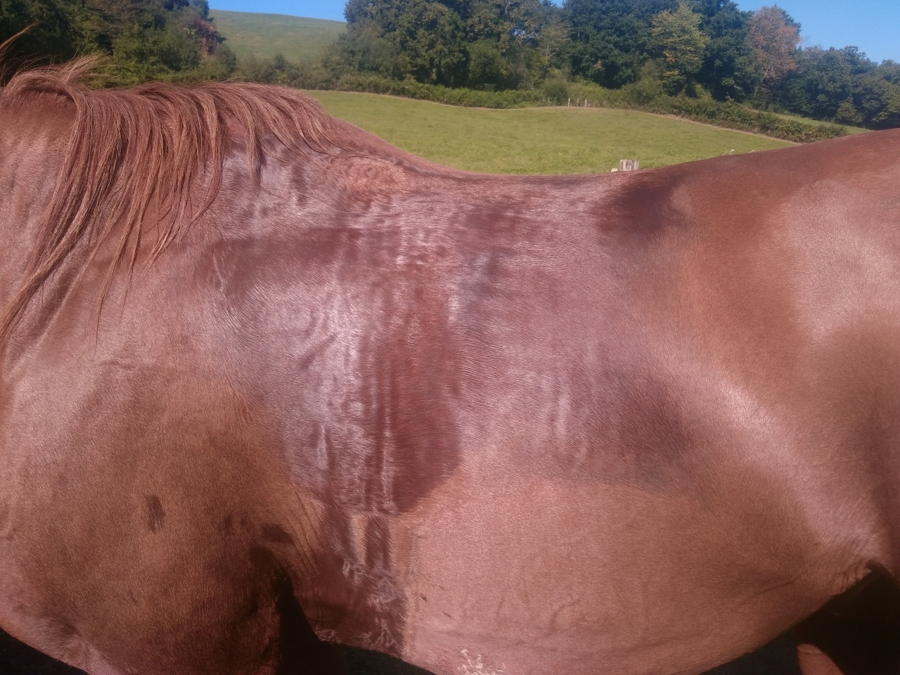 | Dire merci | ![]() Alors position de la selle au retour de la ballade. Donc volontairement je n avais pas attaché le tapis ni au sanglons ni en haut, il a un peu reculé ![]() ![]() Voilà les traces, on voit bien la zone sèche et poils ébouriffé.. |