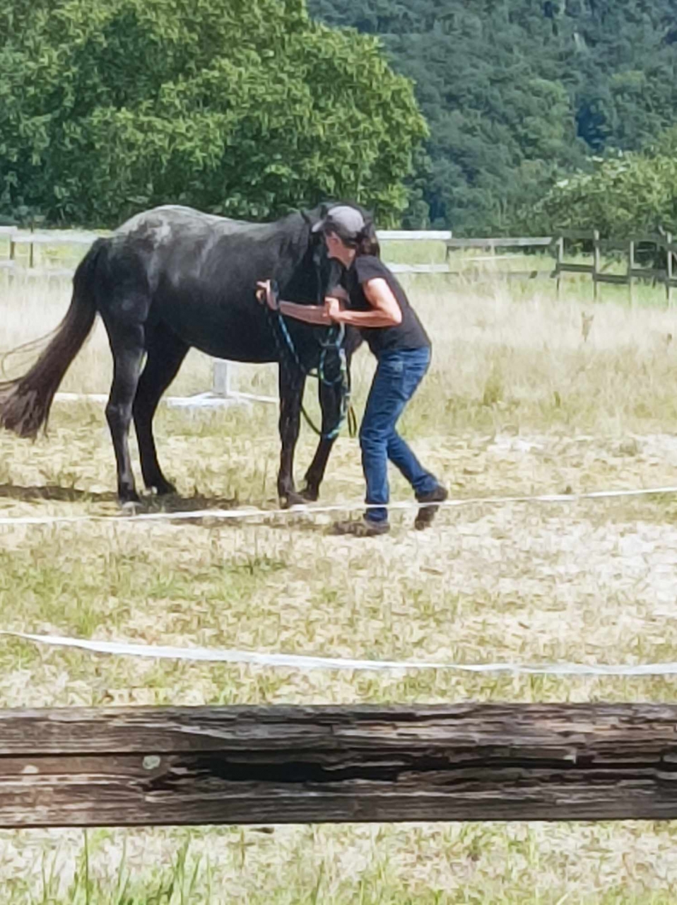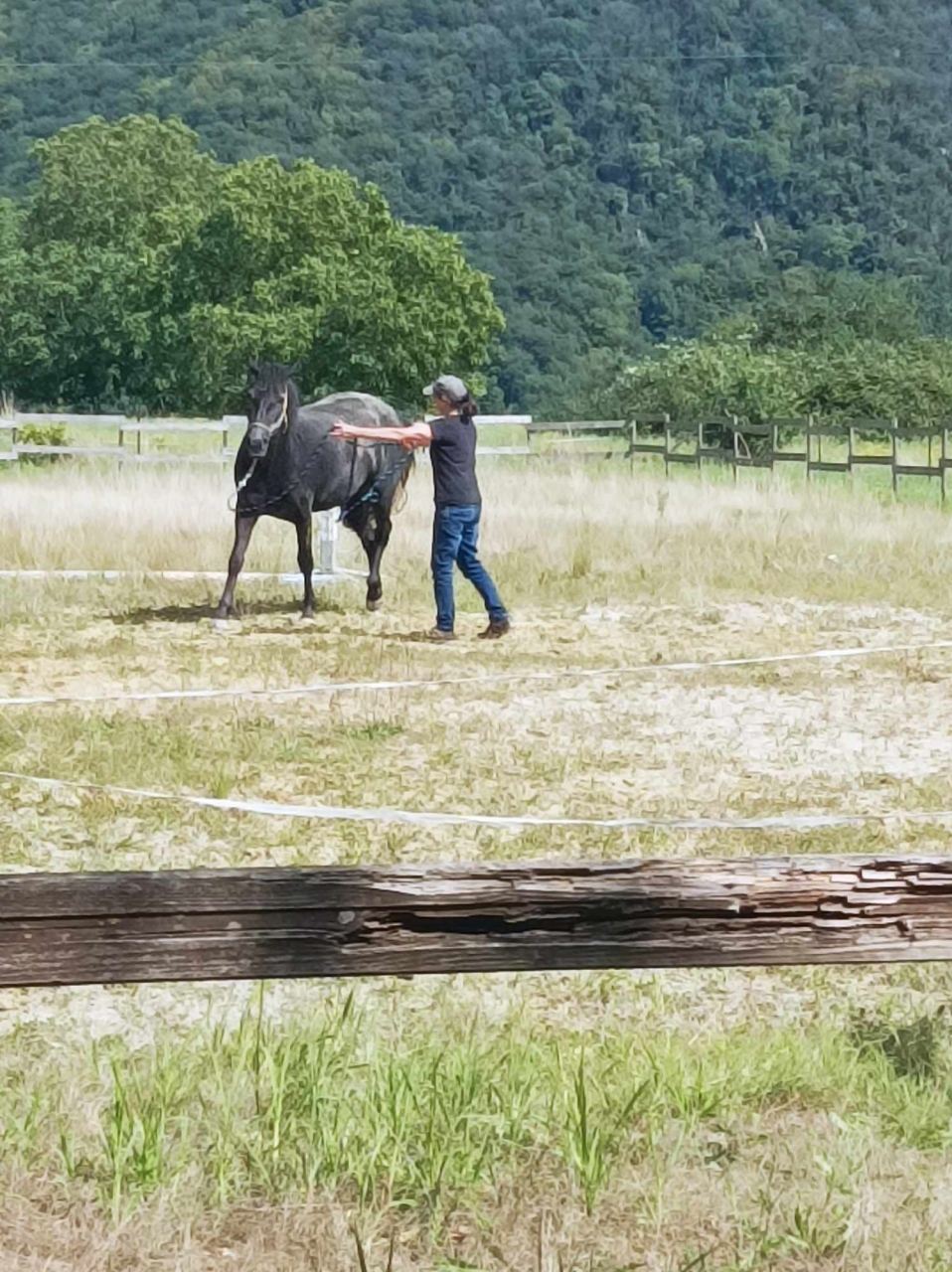 | Dire merci | cet après midi j'ai pris un cours étho à 1 h de chez moi le voyage s'est super bien passé : Kiss Me ne bouge pas le cours s'est très bien passé : j'ai expliqué les difficultés que je rencontrais. J'ai tout perdu, gestes, timing, etc... heureusement que j'ai encore la théorie dans ma tête lol. Mais il y a du boulot ! J'ai eu cours avec Alexandre finalement, et j'aime bien la personne : simple et généreux. Il a vite vu les failles, m'a montré les gestes et m'a guidée pour que je puisse reproduire. au vu du chantier, il me propose la pension débourrage : le cheval est débourré aux 3 allures, clés en main, dans le respect, part en extérieur etc etc... ça me fait envie mais en même temps j'ai envie aussi de faire : mais je ne sais absolument pas si les gestes vont me revenir, etc... je peux aussi faire en y allant 1 à 2 fois semaines et travailler le reste du temps à la maison : ce plan me plaît mieux, mais on va vite arriver dans l'hiver car en faisant comme cela, ça va me prendre plus de temps. et puis ,je n'aime pas la laisser ! Et l'autre soucis est ma santé, et grande fatigabilité : je peux ne pas tenir le coup. faut que je réfléchisse.....je vais déjà essayer de bien la travailler mais la météo est pourrie de chez pourrie, c'est la mousson, il pleut non stop ! Je suis très contente de ma pouliche : elle a du caractère certes, mais comprend très vite et elle est gentille. Juste que si tu fais des erreurs, elle comprend vite aussi |