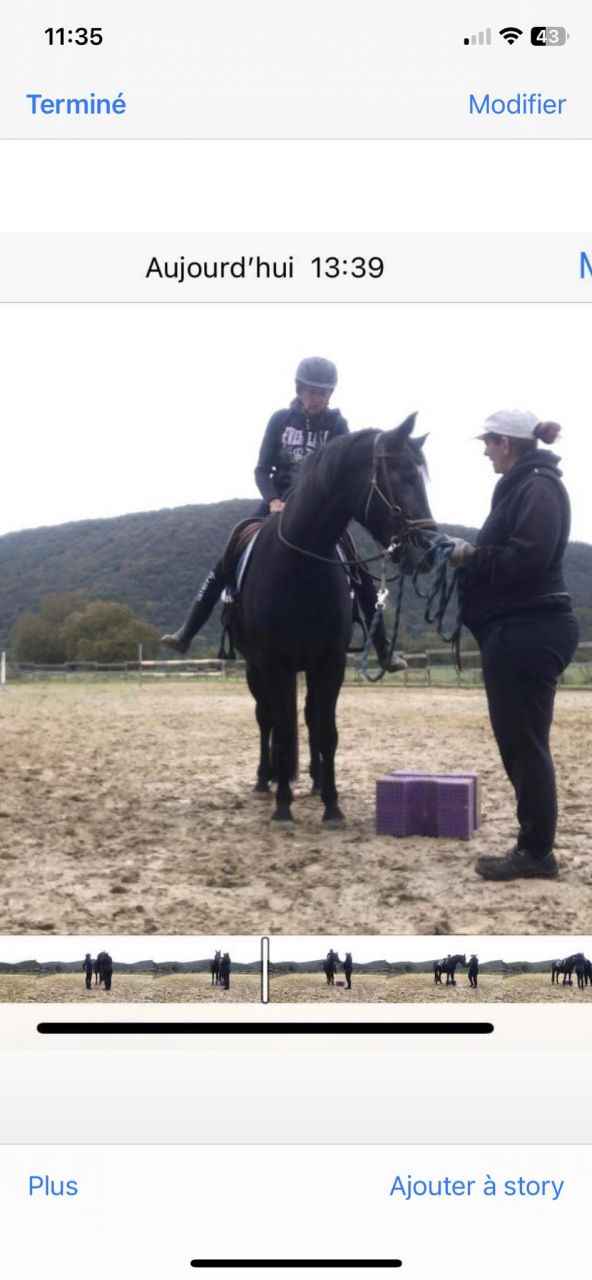 | Dire merci | La mienne aussi on commence à avancer J’ai réussi à la debourrer moi même avec l’aide de Nanette 41 (venue une fois en Presentiel puis à distance ) Puis on a stagné avec la météo pourrie et moi qui ai du mal à retrouver mes marques Lundi et mardi je suis allée chez Nanette pour un stage trop court avec mon chuchoteur préféré Quebecqois et rando avec la belle équipe de chevaux bien dressés Je suis revenue avec une jument transformée On bosse sur le plat les bases car elle est spooky donc on doit y aller doucement mais solidement Je suis cavalière de complet à la base mais pas sure d’y retourner Et je prends de l’âge …. Je passe de bons moments de complicité depuis mon séjour chez Nanette |