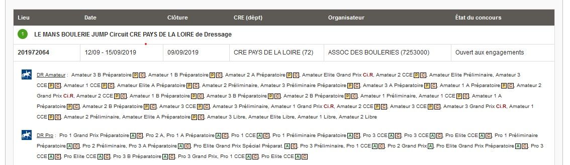 | Dire merci | Du coup, maintenant, c'est indiqué "préparatoire", plus de doute ![]() Quand tu recherches un concours sur "FFE Compet", ça s'affiche comme ça: ![]() [Il faut cliquer sur l'image pour bien voir] Les lettres "C" "A" ou "P" dans les carrés de couleur indiquent les licences concernées par cette épreuve. Si pas de lettre, c'est réservé à la catégorie concernée. Donc si tu veux venir au PEC dans une semaine pour dérouler ta reprise club2 GP face à des amateurs, tu peux engager en "Am3 A préparatoire" Comme ça , on serait dans la même épreuve Message édité le 07/09/19 à 11:17 |