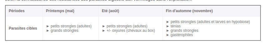 | Dire merci | el bimbo En hiver, il y a très peu d’excrétion d’œufs de parasites dans l’environnement donc les chevaux se ré-infestent peu. Une bonne vermifugation de fin d'automne puis éventuellement au printemps est préférable. [url=https://www.1cheval.com/membre/services/photos/images/244210.jpg" class='zoombox zgallery3502494' ] ![]() [/url] Source Lien Message édité le 23/09/19 à 19:58 |