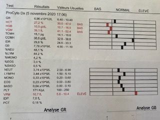 | Dire merci | et je ne vois pas apparaître le frottis sanguin sur ton analyse ??? Il est écrit quoi? |