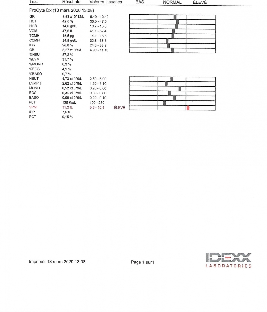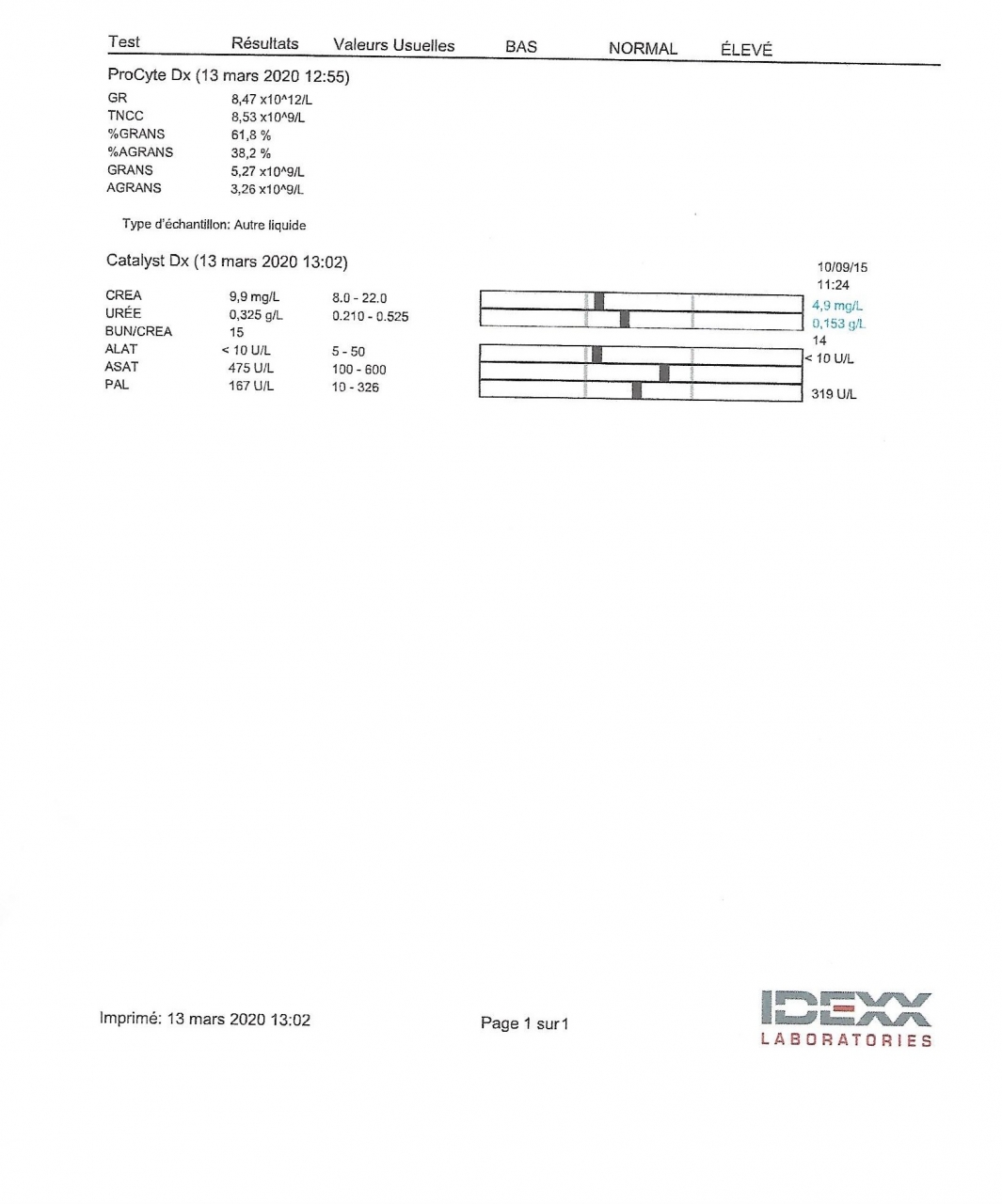 | Dire merci | Le but de la prise de sang était d'éliminer possible pyro. Je n'ai pas les résultats de la prise de sang sous les yeux mais la véto me l'a montré et on était dans les normes pour tout ce qui a été testé ( (les plaquettes un tout petit peu élevées). Non, pas de déshydratation, pli de peau normal. |