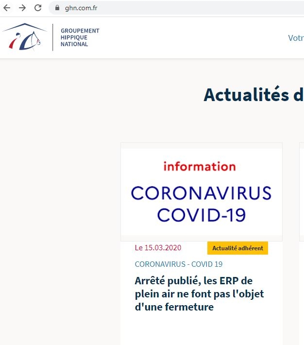 | Dire merci | 🔴 [COVID-19] Communication de la Fédération Française d’Equitation 🔴 Dimanche 15 mars 2020 - 12h30 Depuis les annonces du Président de la République jeudi 12 mars, les mesures Gouvernementales se multiplient pour lutter contre la propagation du Covid-19. ➡️ Dans ces conditions, la Fédération Française d’Equitation relaye l’application concrète de ces mesures aux activités équestres, dans le cadre du principe général de précaution. L'Arrêté du ministre de la santé du 14 mars 2020, publié il y a quelques heures, vient préciser les annonces du premier ministre concernant les nouvelles mesures liées au Coronavirus. L’interdiction d’accès au public des établissements recevant du public (ERP) a été généralisée en dehors du personnel de ces établissements. ➡️ Pour les équidés dits « en pension », un accès raisonné doit être organisé par les dirigeants de structures, en limitant autant que possible les accès simultanés aux installations extérieures exclusivement, et ce afin de maintenir l’entretien et l’activité physique nécessaires au bien-être des poneys et chevaux. Il s’agit là de préconisations envisageables à cette heure, dans l’attente des prochaines précisions ou annonces du Gouvernement. Pour consulter le texte de l’arrêté : https://www.legifrance.gouv.fr/affichTexte.do?cidTexte=JORFTEXT000041722917&categori&fbclid=IwAR1O-33ODqVeEhfXRzLmHMae2dT6ogOeRTjAQr0zOC-L2EiW31CLWfvLEKs Les équipes de la Fédération restent mobilisées afin de vous communiquer toute évolution impactant les activités équestres. |