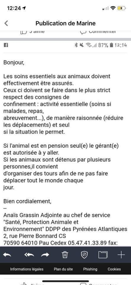 | Dire merci | Perso j'ai mes chevaux au pré et voilà les docs que j'ai faits: - attestation de sortie dérogatoire où j'ai inscrit mon trajet, le caractère journalier et les besoins essentiels - attestation sur l'honneur écrit de ma main qui reprend l'identité et l'immatriculation de mes deux chevaux, la fréquence de déplacement, le lieu de détention et son numéro d'immatriculation aux HN et que j'en suis et le propriétaire et le gardien et que je dois subvenir à leurs besoins essentiels (nourriture et eau) - attestation du lieu de détention enregistré aux HN - copie des cartes d'immatriculation des deux chevaux. |