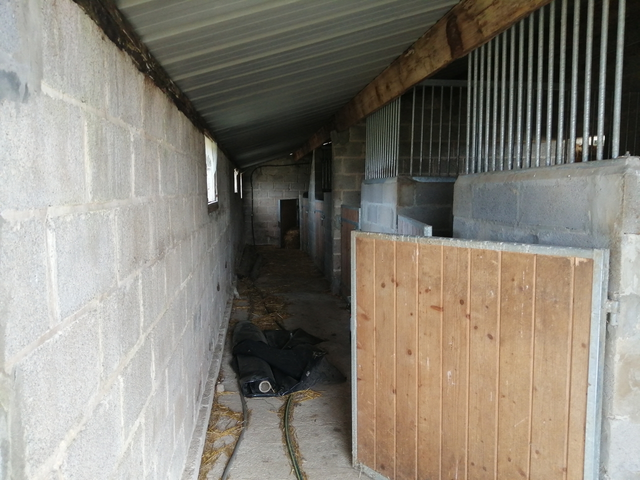 DéconnectéDire merci | Effectivement ça ne se prête pas trop à des box en accès libre. Pourquoi ne pas les proposer en pension poney ? A moins, qu'au lieu que les chevaux entre par le couloir, ils entre par le coté du box. Et dans ce cas, le couloir peut faire office de stockage. Mais ça semble compliqué de faire une entrée par le haut de l'écurie, contrairement au bas. Sinon il faut détruire le couloir (et comme ça tu as une dalle devant les abris), mais ça veut dire toucher au toit ... |