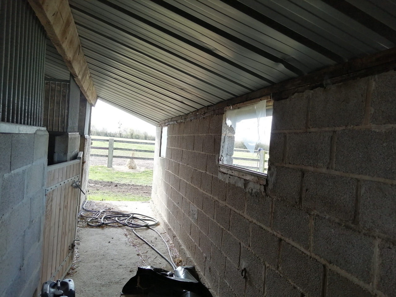 DéconnectéDire merci | j'ai un de mes box (celui de quarantaine) ouverts aux intempéries dominantes et c'est la merde, surtout quand il neige même avec une avancée de toit devant c'est pas glop, donc si j'étais toi je ne virerais pas (tout) le mur en parpaing. Si t'as encore 8 box de libres c'est clair que ça ne vaut pas trop la peine d'en faire des box. Avec la configuration couloir laisser en libre accès ça va faire un couillon (dominant de préférence) qui va se mettre à l'entrée du couloir et tous les autres resteront dehors agglutinés derrière lui (ça c'est du vécu, le couloir c'est THE place to be quand on est cheval). Je sais que je ne suis pas très constructive sur ce coup là j'essaye juste de t'éviter des erreurs que j'ai moi même commises |