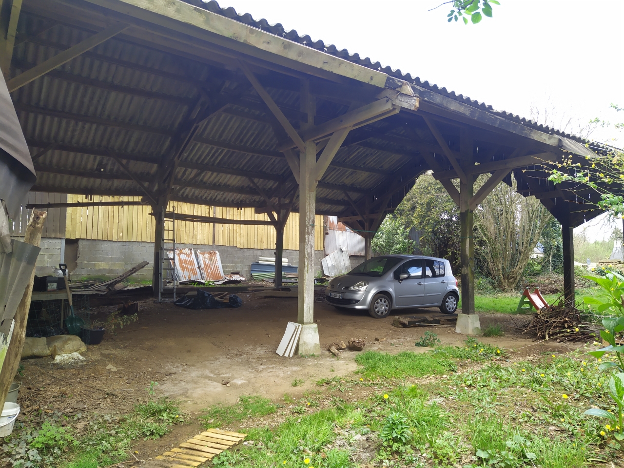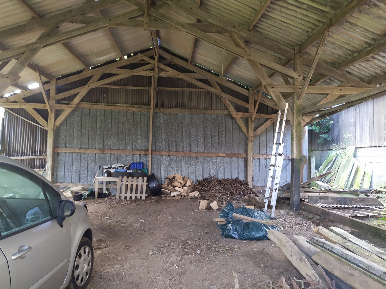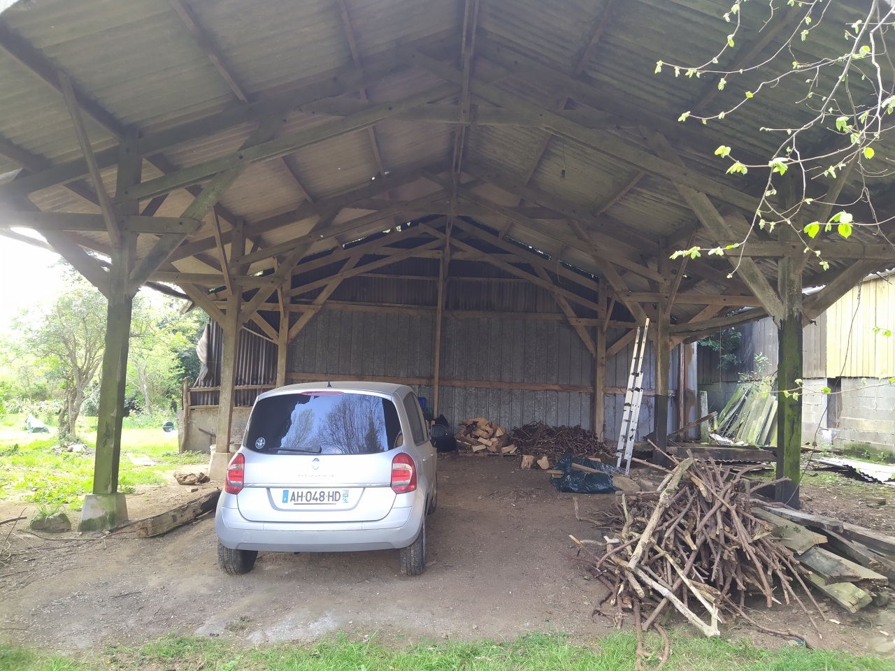 | Dire merci | Donc l'idee serait de les installer au niveau de la partie centrale du hangar, pour plusieurs raisons : -pas d'infiltrations du toit -partie de gauche pr stocker du bois ( acces le plus rapide depuis la maison) -partie de droite qui permet d'acceder au chemin vers le hameau ( passage voiture, tracteur etc...) |
