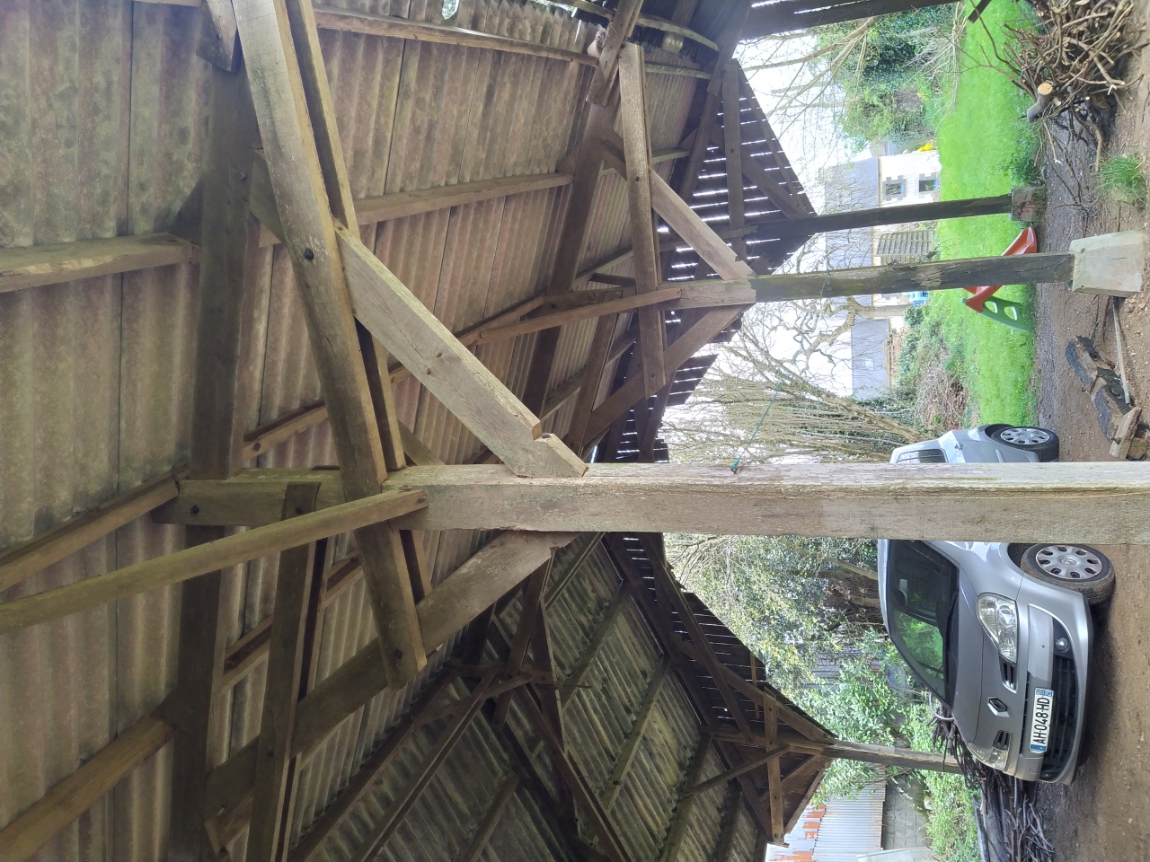| Dire merci | Bon, alors voilà le fameux hangar. Malgré son aspect déchetterie actuellement il est ds un État relativement correct. Vue du jardin, il est bardé à l'ouest, protégé du vent par de grands arbres, c'est impressionnant ![]() Charpente ![]() Vue de l'Est ![]() |