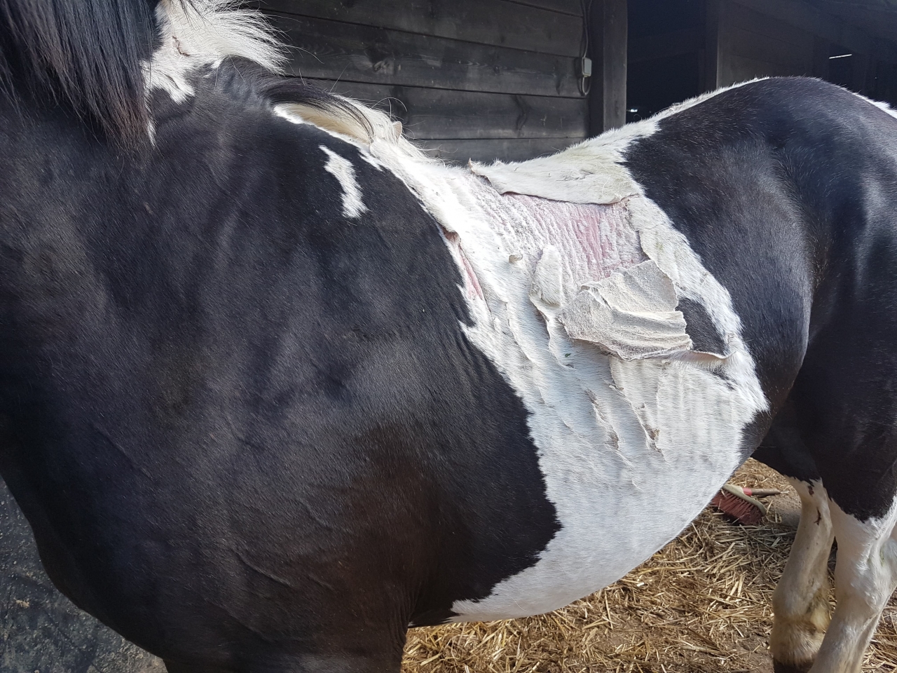 DéconnectéDire merci | bon j'ai eu un peau de back ground au moins sur les dernières semaines. Il y a 3 semaines, un mois le cheval n'avait 'rien' en tout cas rien de visible. Elle a été mise dans une grande prairie 'en herbe' avec une dizaine d'autres chevaux qui eux n'ont rien eu ... après +- 15 jours elle a fait 'un coup de soleil' qui a dégénéré en 'ça'. La peau est super saine sauf 2 grosses plaques sur le dos qui ont suinté, certains poils sur les parties abrasées ont survécu il y a donc de fortes chances que ça repousse. Elle a dû commencer par l'arrière de la croupe où ça recommence bien à pousser. Bon avec le foie on va revenir à l'éternel débat de l'hépatodrainant ou pas, la véto n'a pas encore eu le temps de passer pcq finalement c'est pas méga urgent. |