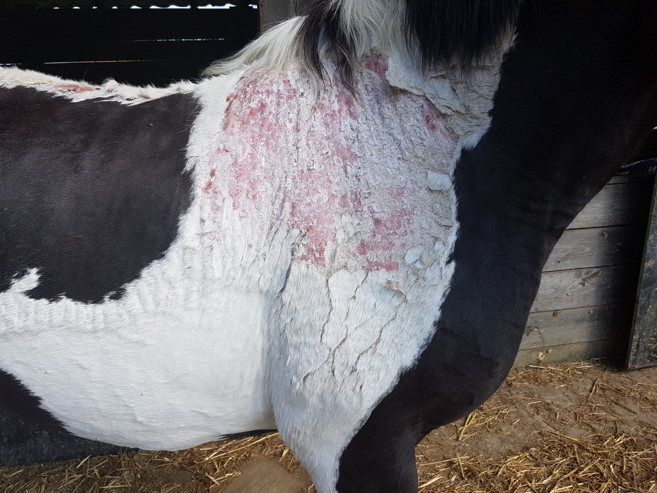 | Dire merci | La jument d'une amie a fait la même chose : paint, elle desquamait principalement sur les parties peau rose, et ça tournait entre l'encolure, l'épaule, le ventre, entre les cuisses et les balzanes aussi parfois. Elle avait une atteinte hépatique probablement lié à ingestion de seneçon. Elle a eu un long drainage hépatique et soins locaux .c'est passé au bout de plusieurs mois. |