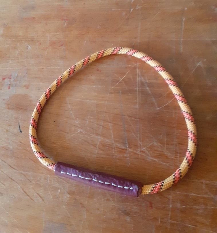 | Dire merci | Sinon juste un noeud diamétralement opposé à l'anneau (donc au garrot) pour voir pour la longueur ? et une fois la bonne longueur trouvée, replier la cordelette de manière symétrique et coudre / ligaturer serrer, avec de la ficelle ou de la corde fine (çà évite de couper...) |