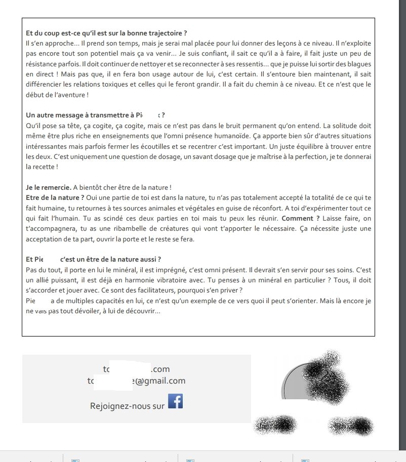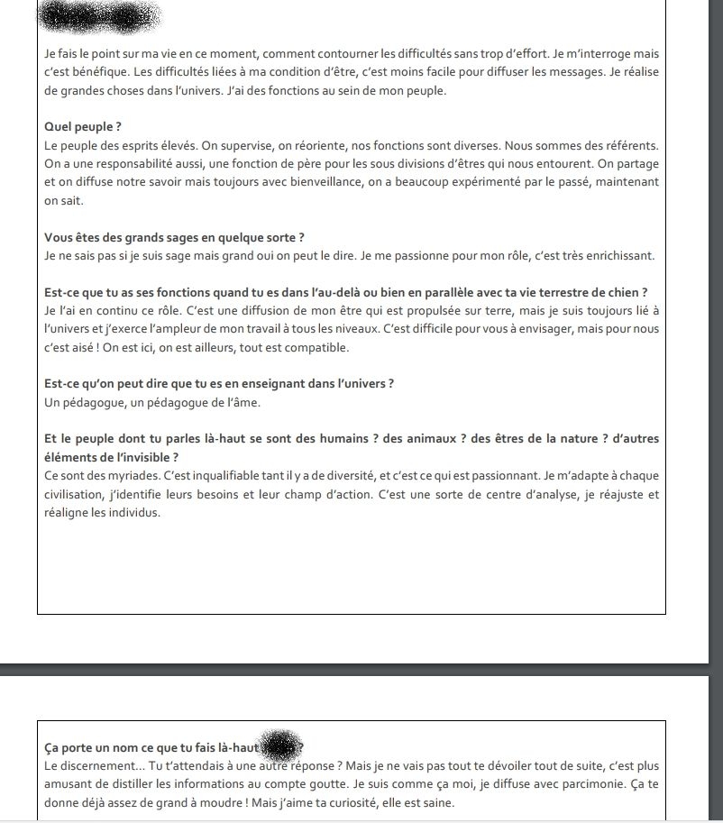 | Dire merci | sans nier qu'il puisse y avoir des personnes avec un réel don (en présentiel, par contre), j'ai de sérieux doutes sur un bon paquet de charlatans.... voici par exemple ce qu'un client m'avait envoyé, "expliquant" la relation avec son (très gentil) chien. ![]() ![]() ![]() ![]() ![]() ![]() |