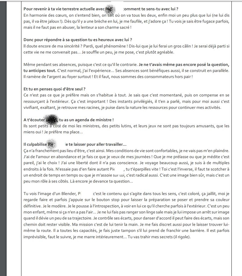 | Dire merci | En fait ce qui me gène le plus dans ce "compte-rendu" c'est la logorrhée de la nana. Si les réponses avaient été courtes, formulées de manière simple et presque "factuelle", on aurait au moins pu penser qu'elle y croit, à son truc. Là, on assiste à un délire littéraire complètement siphonné qui donne vraiment l'impression qu'elle prend son pied, qu'elle se fout de la gueule du monde avec jubilation. Soit elle ricane derrière son clavier en tapant ses histoires "d'êtres de lumière" en prenant bien les gens pour des cons (et visiblement ça marche) soit elle est à fond dedans et là... ben ça relève de la psychiatrie en fait. Qu'une petite fille s'imagine un monde fantastique peuplé de petits elfes et de lutins, ou qu'un écrivain se lance dans l'heroic-fantasy parce que c'est son créneau et que ça fasse rêver les lecteurs, ok. Qu'une nana invente des conneries pareilles contre de l'argent en disant que c'est Rex qui parle et que ça va régler tous les problèmes de son maître.... éthiquement parlant on est très limite. |