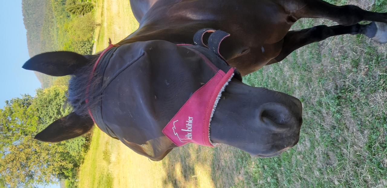 | Dire merci | Je reste aux franges pour Sherpa qui a du mal avec le masque aussi. Rien à voir avec les mouches qui passent dedans, mais quand je lui enlève le masque, il devient hystérique. je crois que c'est le changement de visibilité qui le perturbe en fait. Comme il n'a pas de soucis de conjonctivite, je n'insiste pas, contrairement à Bellinda, mais qui, elle, le supporte très bien (et se laisse le mettre en liberté au champ, là où Sherpa me fait clairement comprendre que ça ne lui plait pas du tout). |
