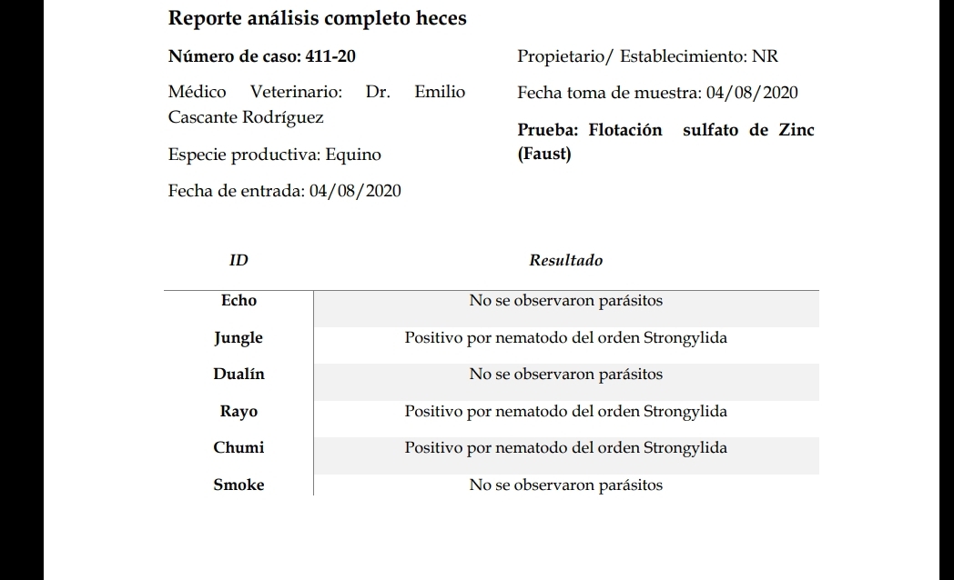| Dire merci | Hello a todos Je demande un second avis ici puisque les vétérinaires de mon pays ne sont pas ..... bref J'ai 30 chevaux. Jai fais une copro sur certains, pour voir à quoi j'allai les traiter pour le vermifuge. Voici les résultats : Certains chevaux sont négatif, ce sont des chevaux de propriétaires qui sont arrivés récemment. Les miens répondent positif aux nomatode de la familles des strongles Le vétérinaire me dit d'utiliser PANACUR 3 jours consécutifs . Vous en pensez quoi ? Ça fait pas beaucoup 3 jours consécutifs ? Il ne vaux mieux pas faire jour 1 puis jour + 15 ? J'ai pas plus de détails concernant les résultats, je n'ai malheureusement pas de taux ... ![]() Merci d'avance à tous |