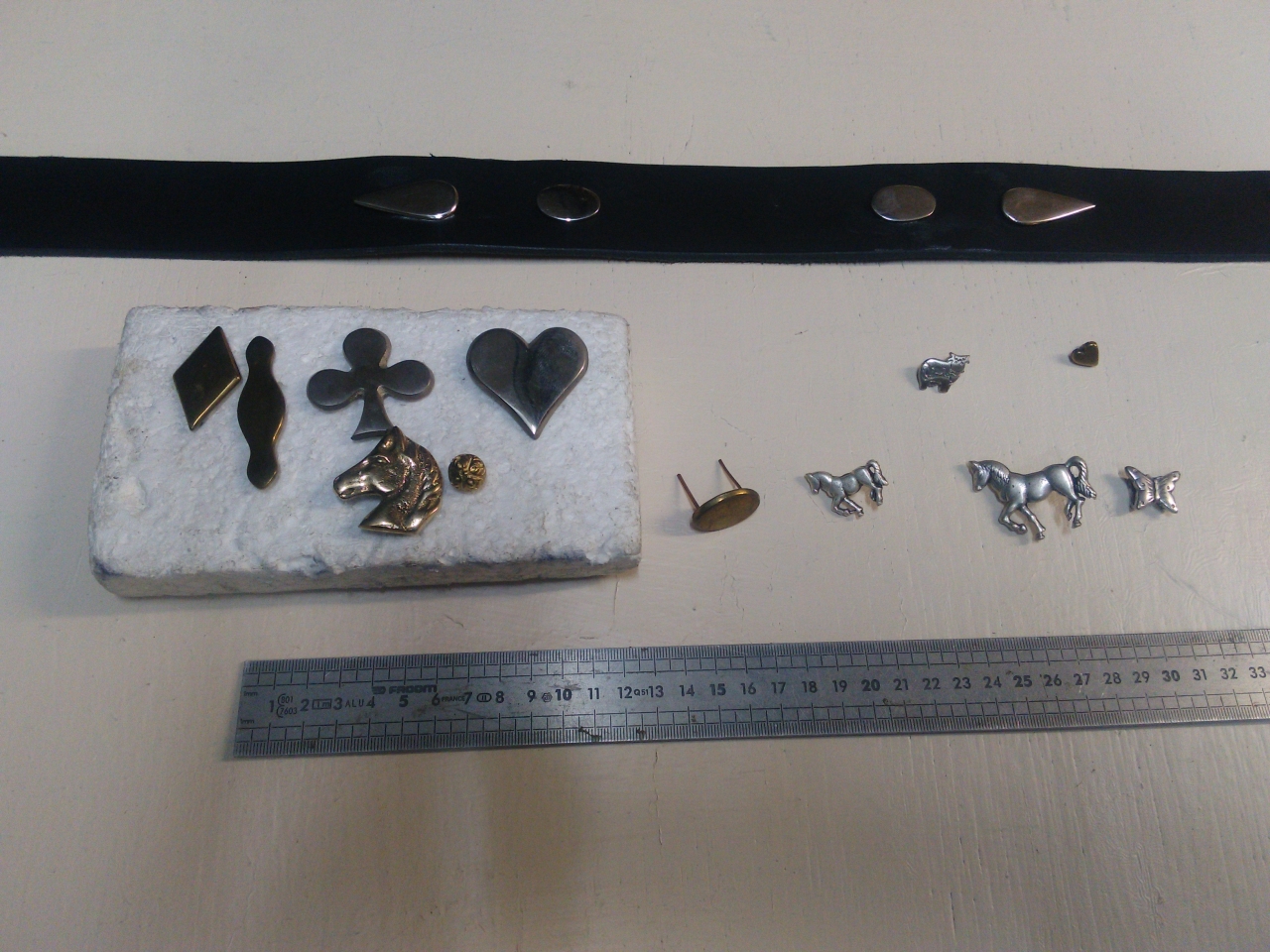 | Dire merci | Le cuir repoussé risque de ne pas se voir beaucoup sur du noir, et également de ne pas tenir très longtemps. Par contre, on peut fixer des ornements métalliques (cuivrés ou argentés): il en existe de nombreux modèles, de toutes les tailles, fixés surtout par tiges ou par rivets: ![]() Je peux reteindre ta selle, et y fixer les ornements métalliques ou en cuir de ton choix. J'en ai certains en stock, et beaucoup d'autres peuvent être commandés. N.B: ceux fixés par tige peuvent être ultérieurement récupérés et refixés ailleurs. |